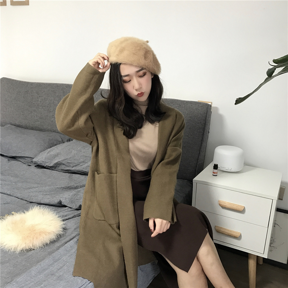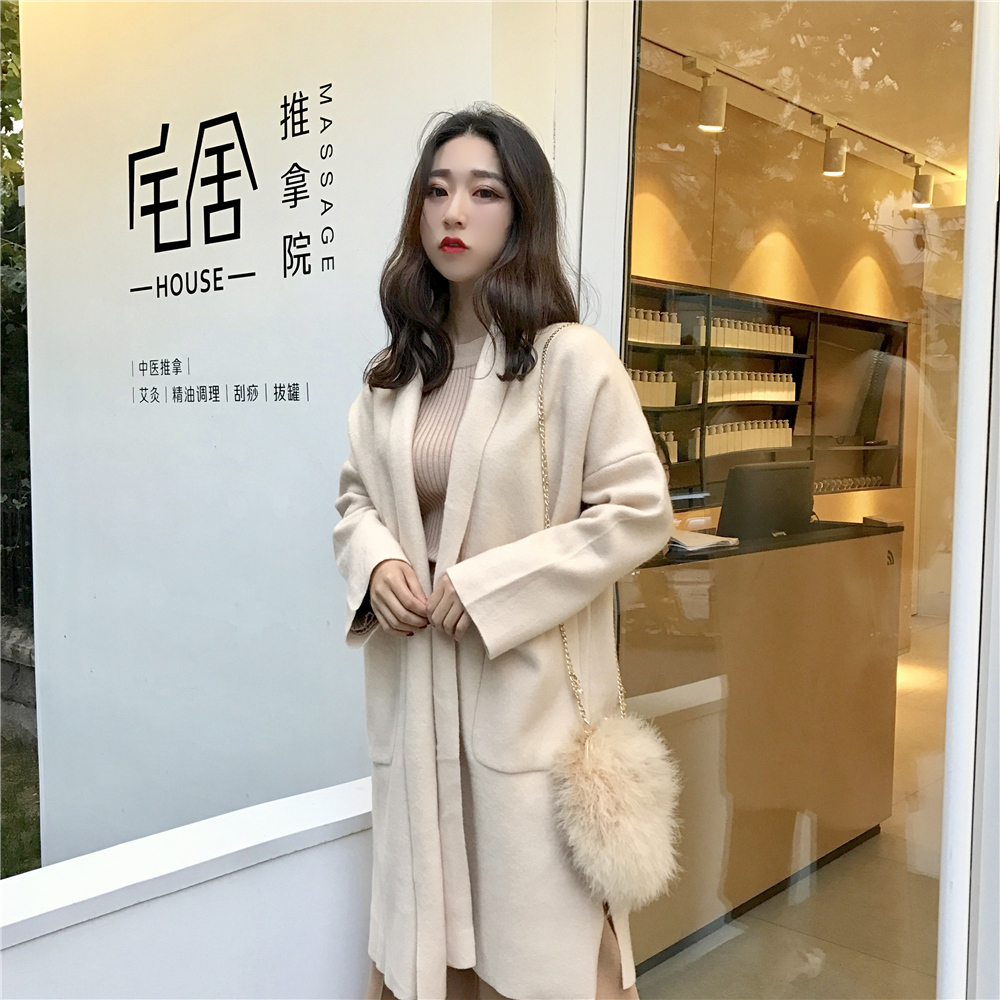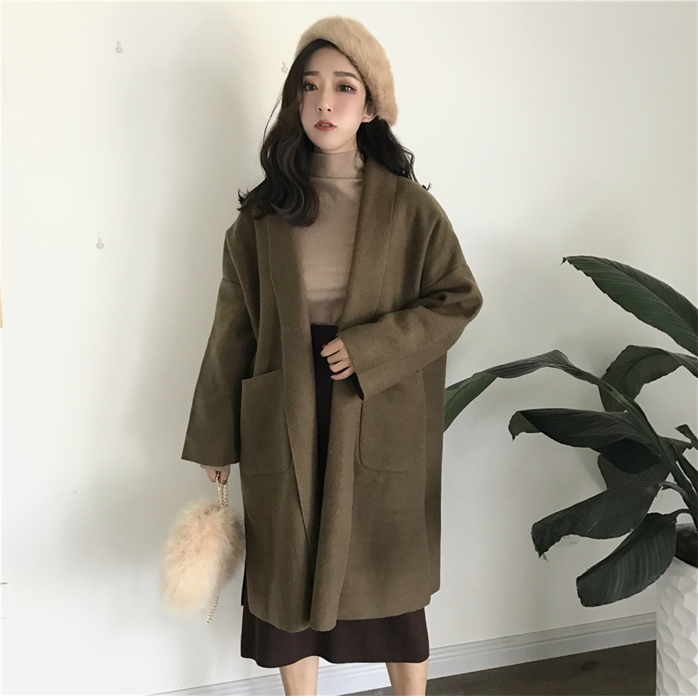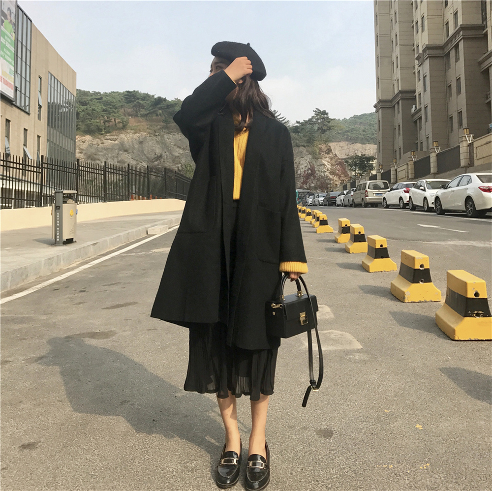 / 新品chic簡約純色時尚慵懶風寬松大口袋中長款薄呢氣質外套女潮流