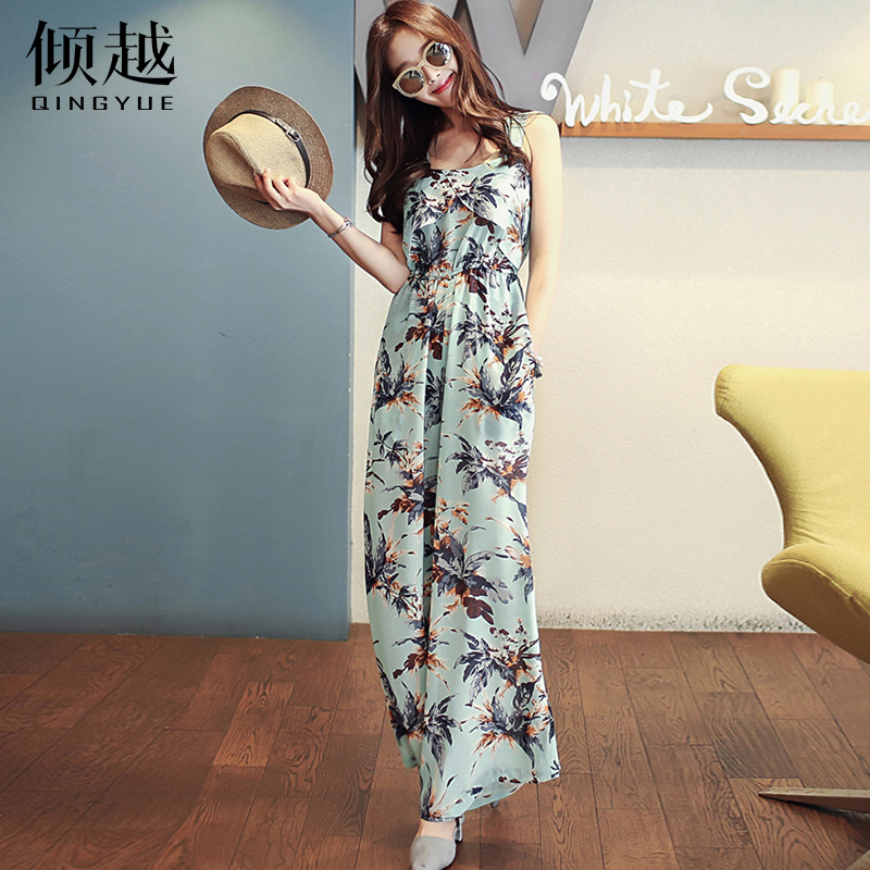 / 傾越印花波西米亞度假海灘長裙闊腿連體褲女吊帶雪紡連衣裙2017夏