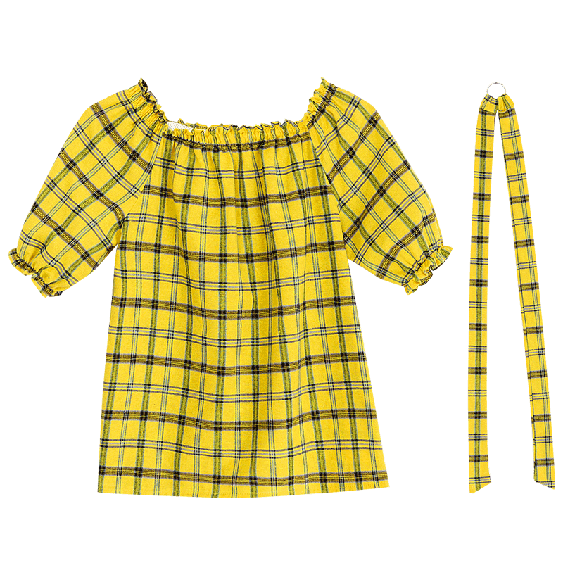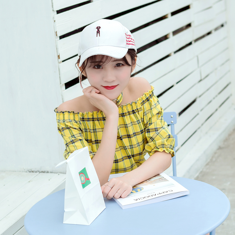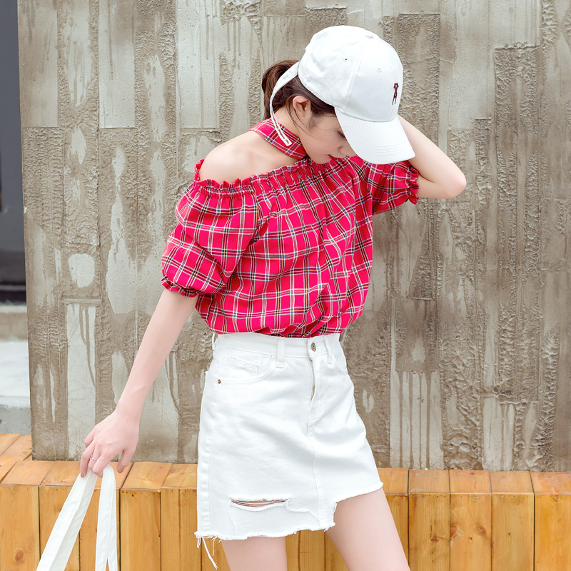 / 夏裝新款女裝韓版一字領露肩短袖格子襯衫學生百搭襯衣上衣潮