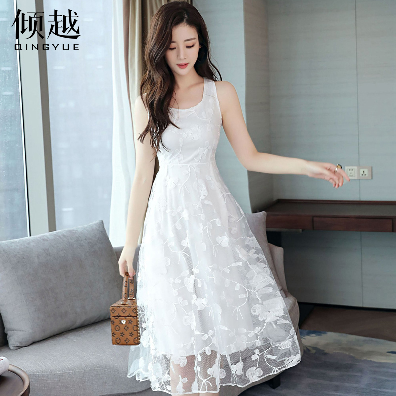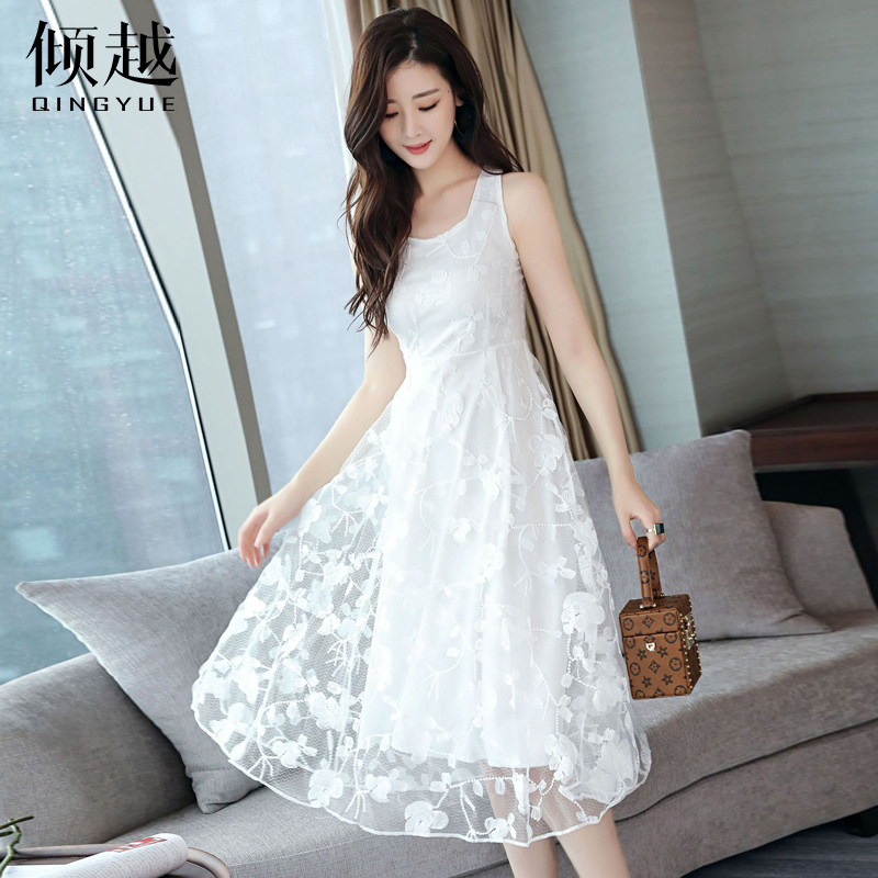 / 傾越2017新款夏裝甜美小清新蕾絲無袖連衣裙雪紡公主沙灘背心裙潮