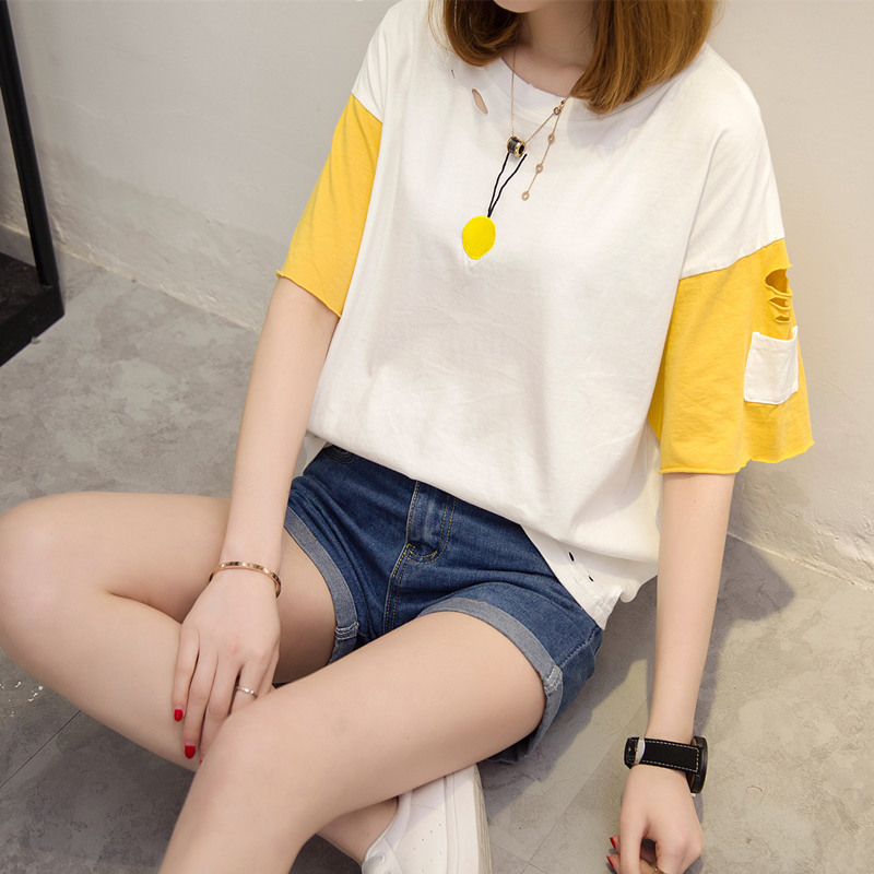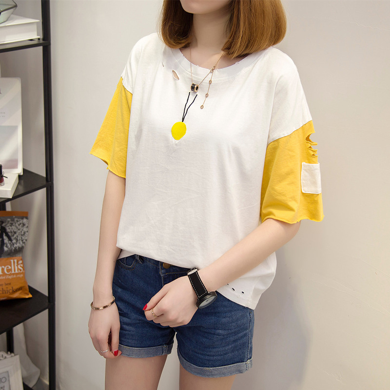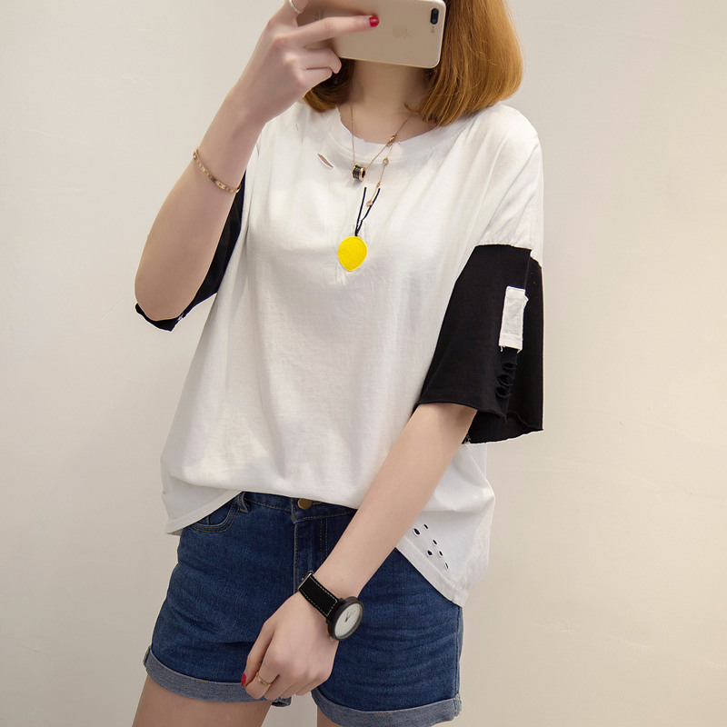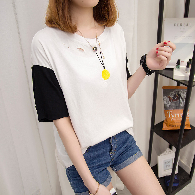 / 夏裝新款女裝寬松白色t恤女中長袖破洞韓版上衣女夏百搭體恤