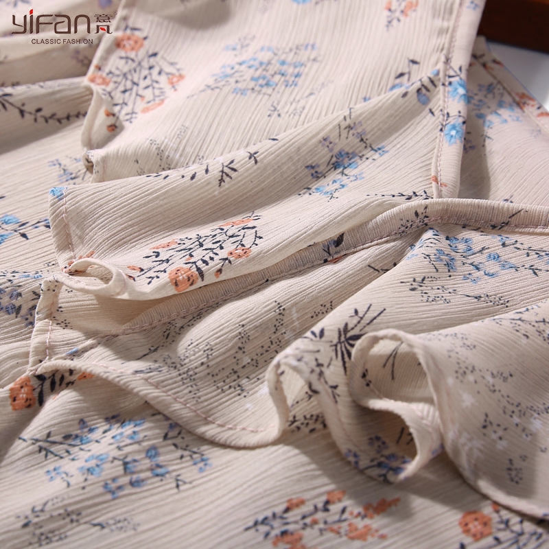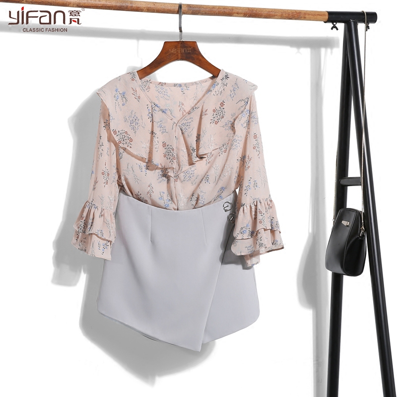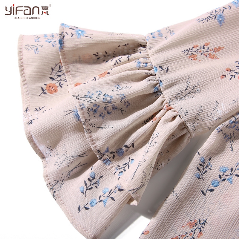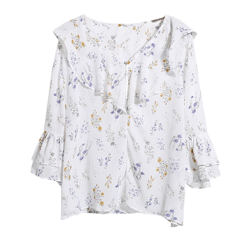 / 夏季新款女裝小清新碎花荷葉邊V領喇叭袖雪紡衫七分袖上衣薄