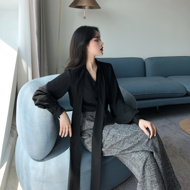 秋裝新款韓版慵懶風漏肩鎖骨上衣闊腿褲高腰復古直筒褲女時尚套裝