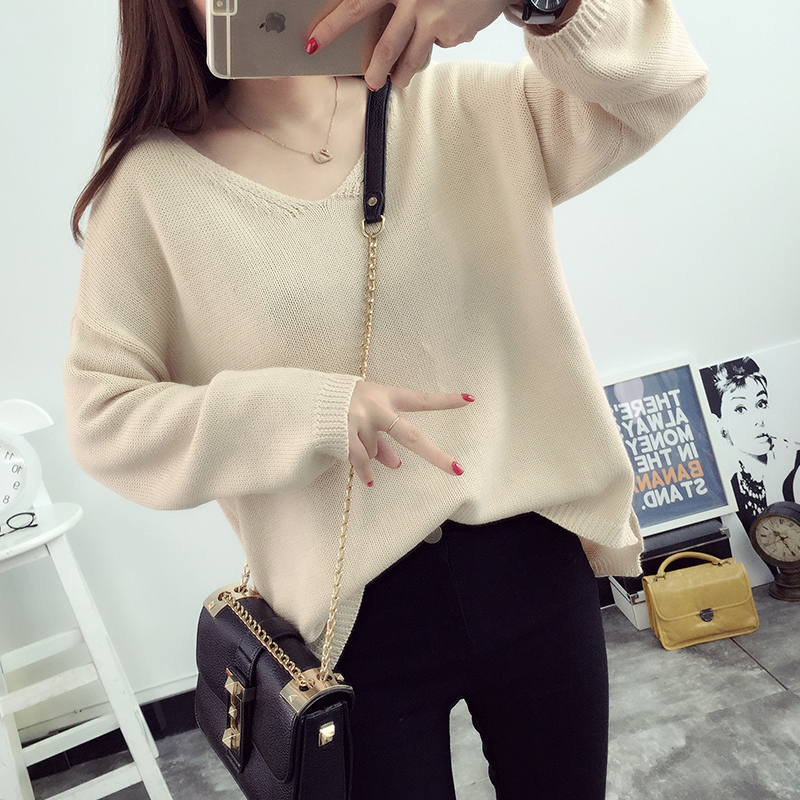 毛衣春秋新款套頭女寬松針織打底衫v領長袖薄款毛衣春裝百搭