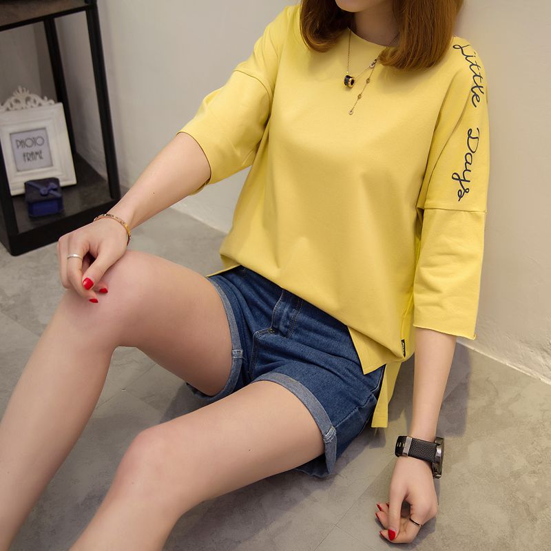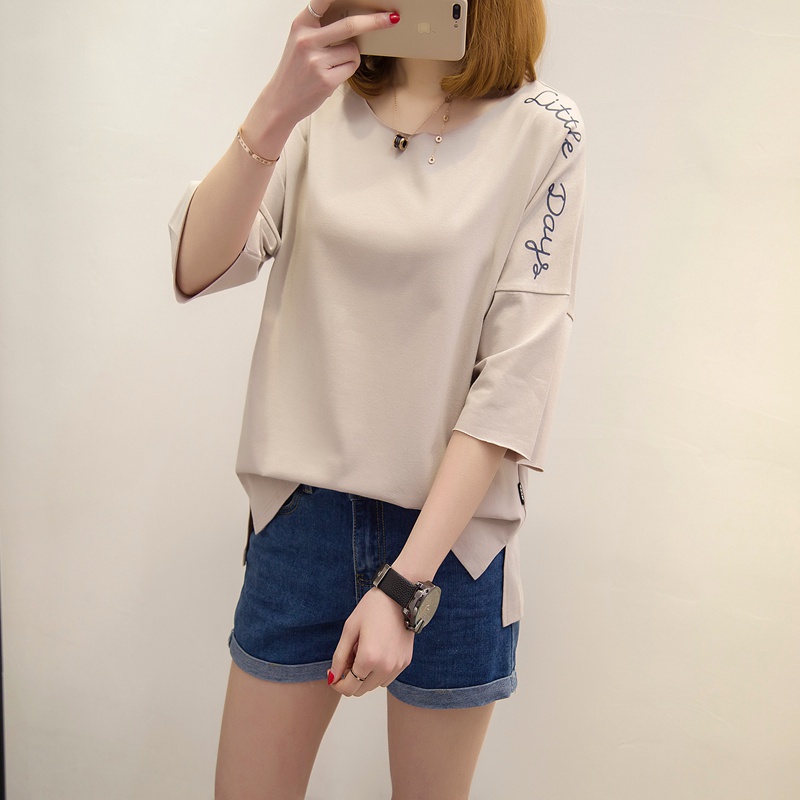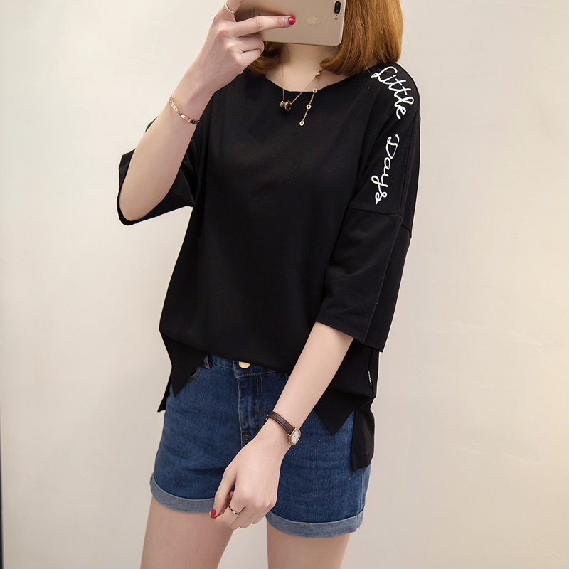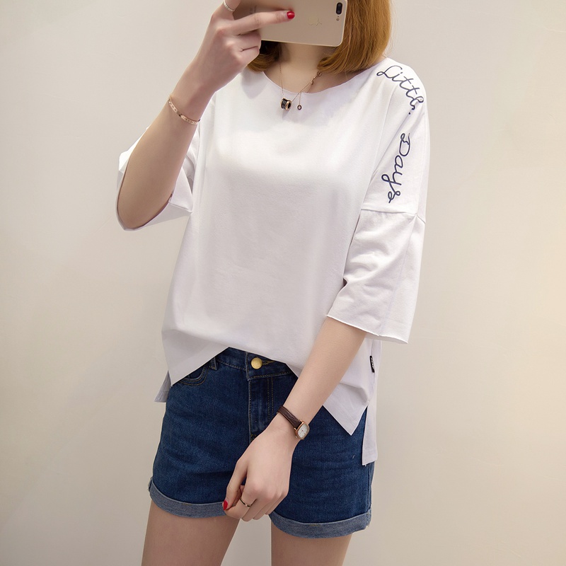 短袖上衣女夏新款寬松白色t恤女中長袖韓版字母體恤小衫百搭
