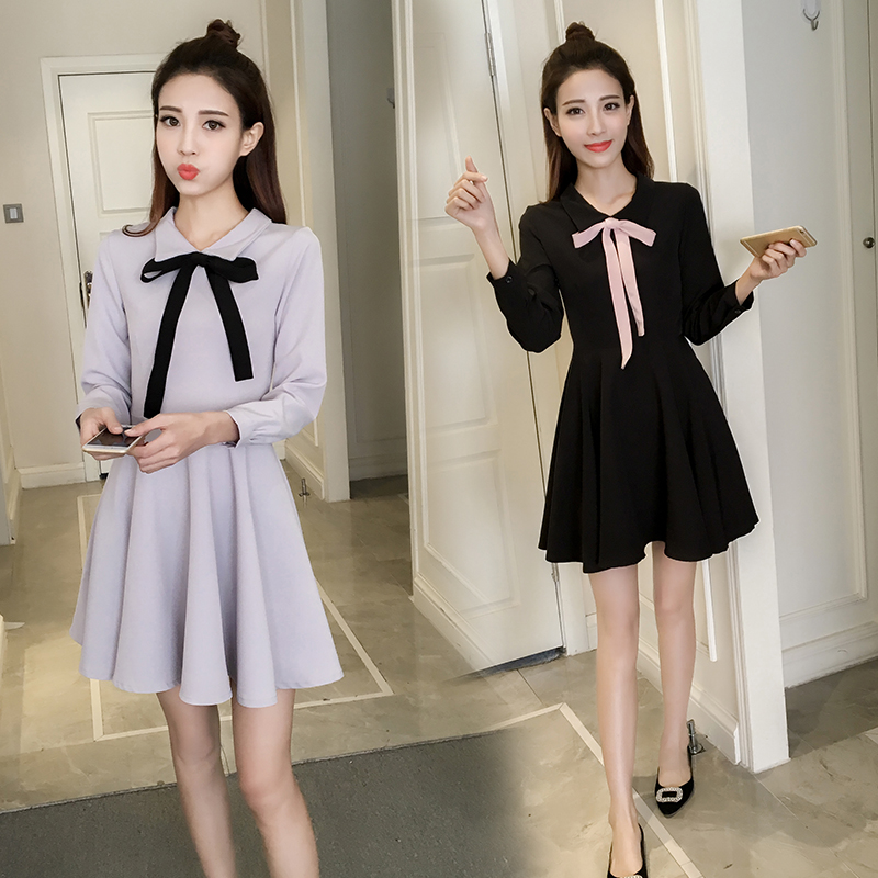 / 早春新款復古赫本小黑裙顯瘦高腰長袖連衣裙秋冬女蓬蓬打底裙