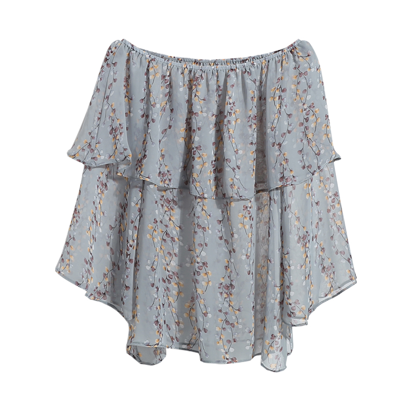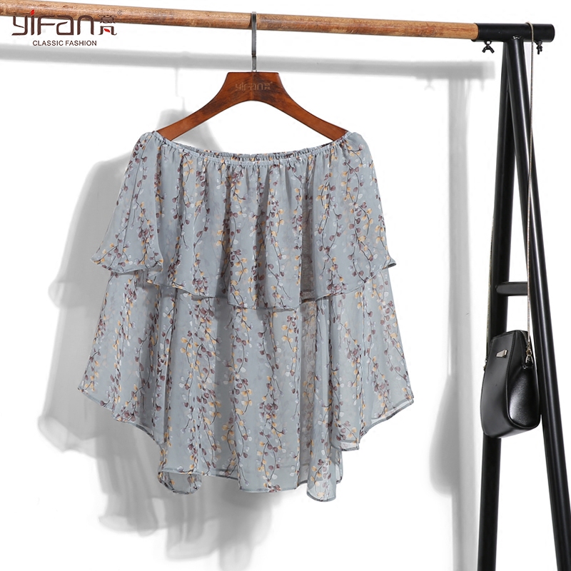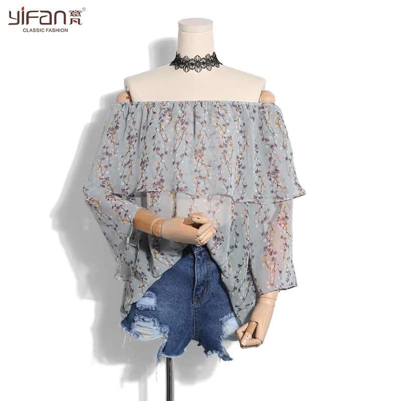 / 韓國新款氣質荷葉邊一字領性感露肩寬松喇叭袖雪紡衫上衣女夏薄款