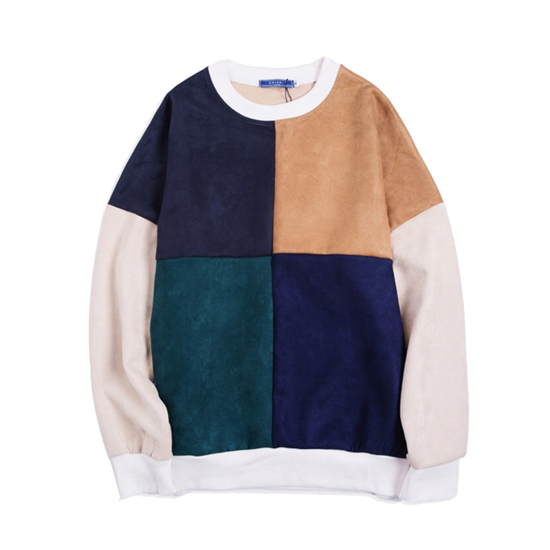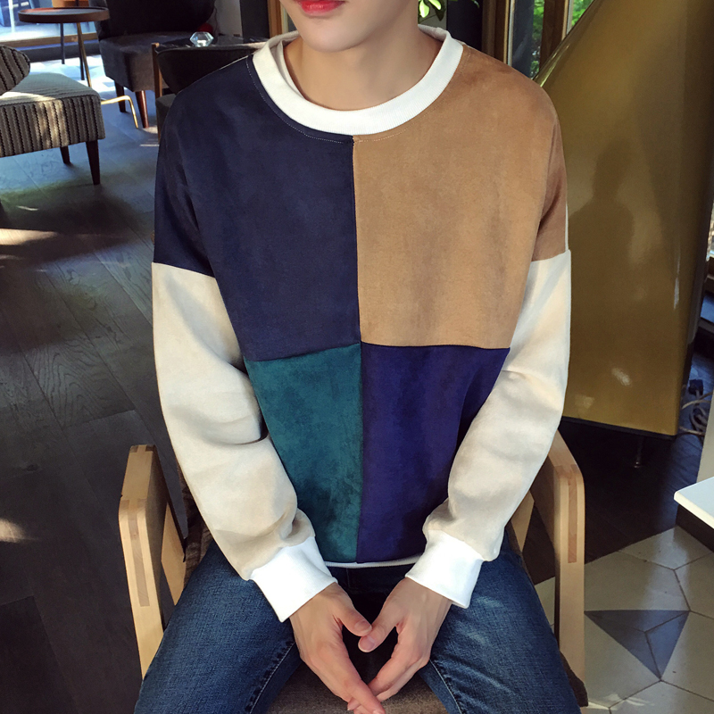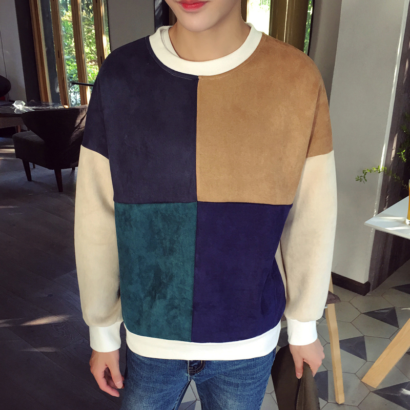 港風男裝麂皮絨韓版休閑拼接圓領青年套頭男士衛衣