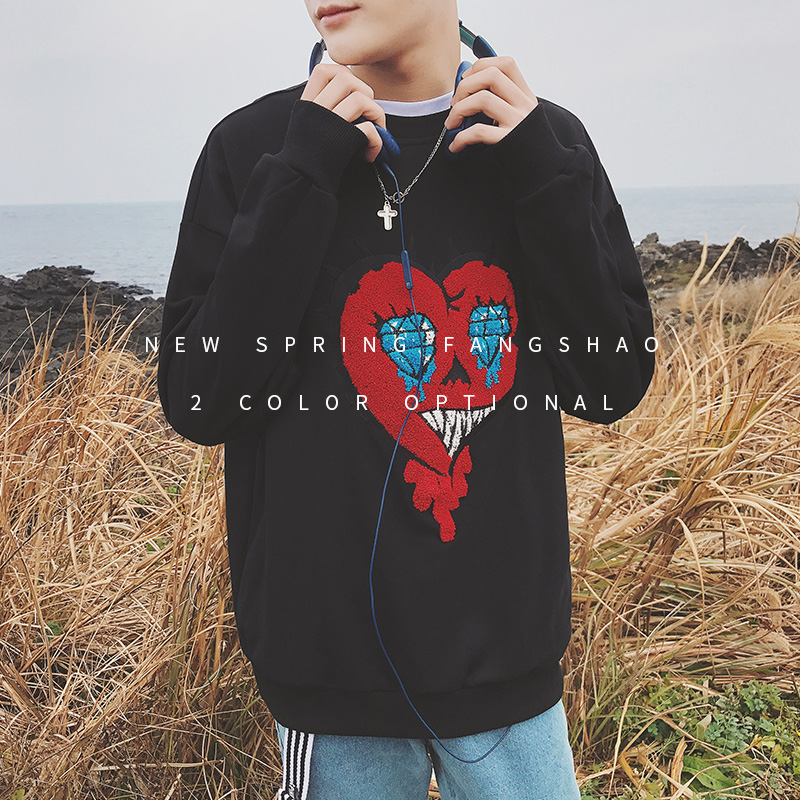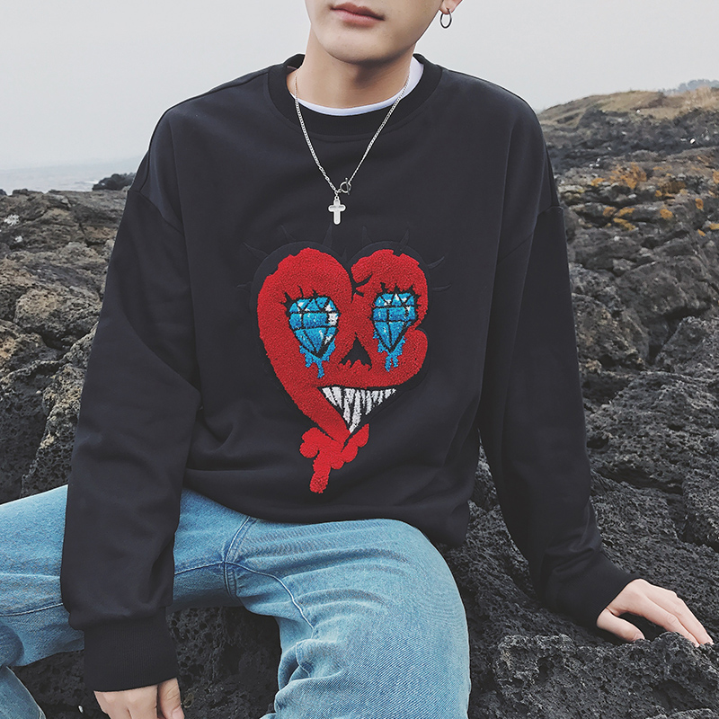 男裝植絨愛心卡通圖案韓版寬松男士圓領衛衣春外套