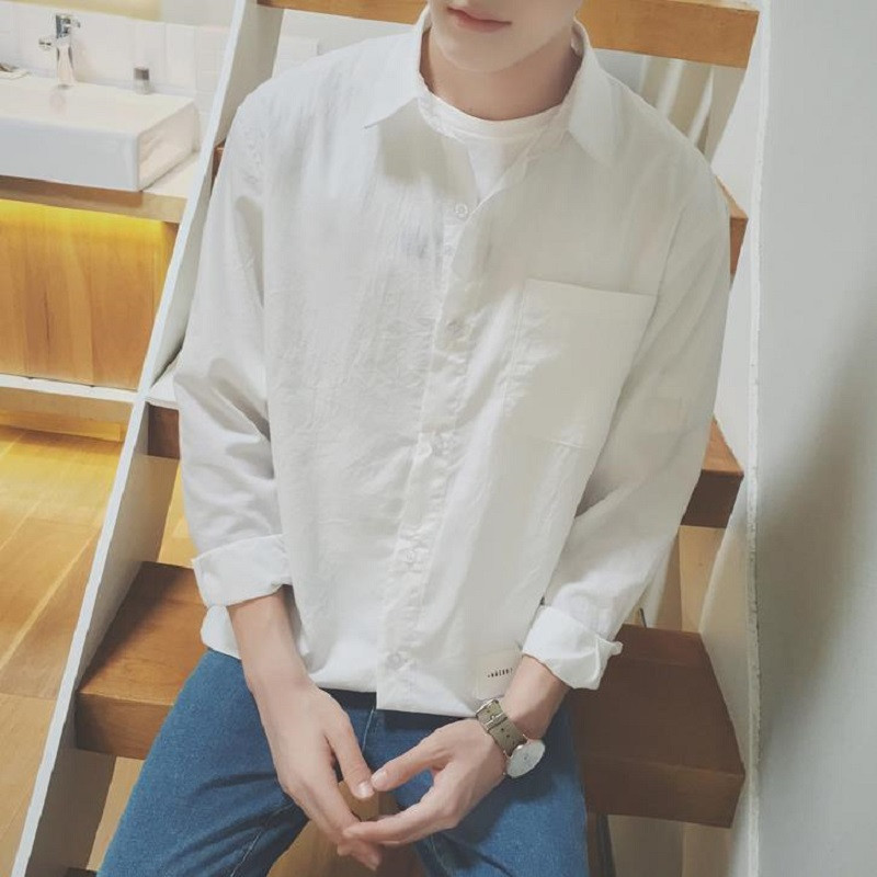 / 秋季新款韓版原創小清新純色男士寬松長袖襯衣襯衫