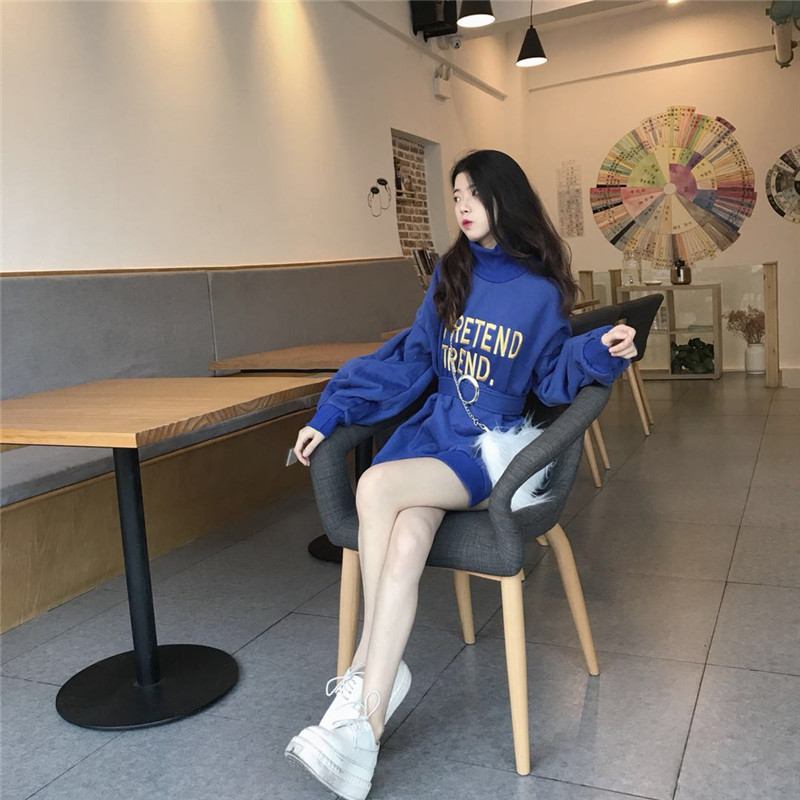 / 秋冬新品高領刺繡字母寬松顯瘦中長款加絨開叉衛衣學生女潮配腰帶