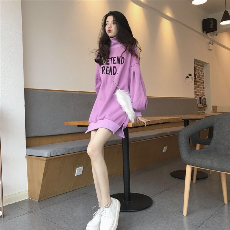 秋冬新品高領刺繡字母寬松顯瘦中長款加絨開叉衛衣學生女潮配腰帶