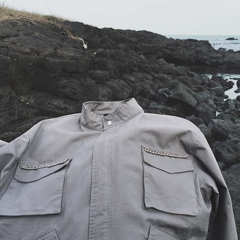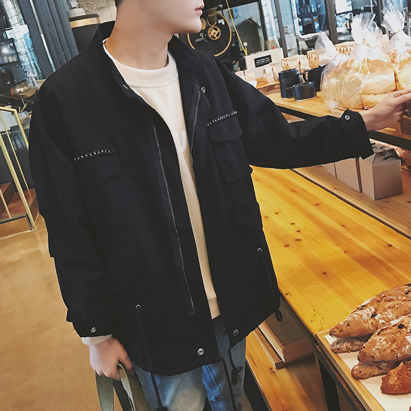 男裝17新款復古鐵鏈鑲邊男士寬松立領春季夾克外套