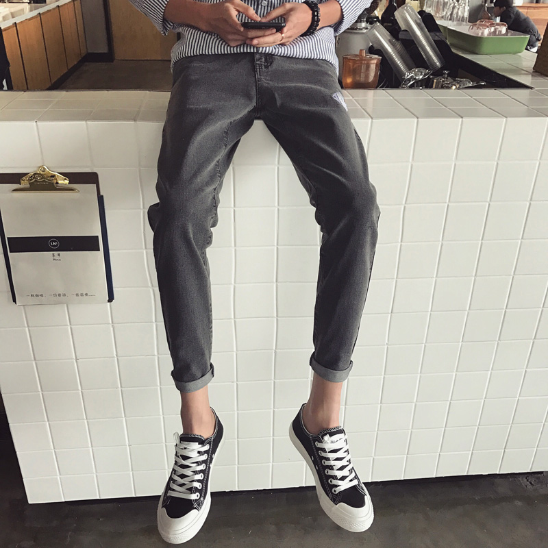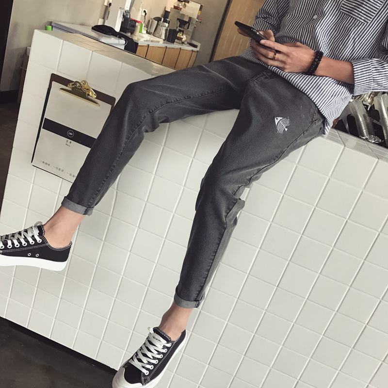 / 男裝刺繡圖案韓版新款修身小腳牛仔褲錐形哈倫褲男