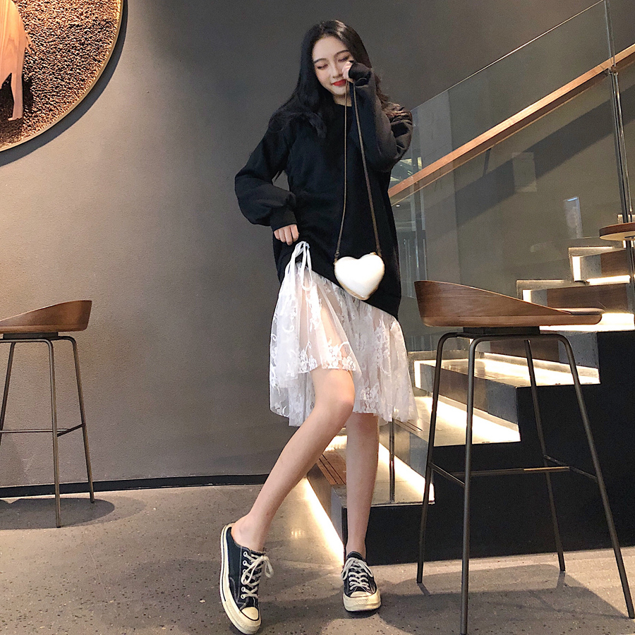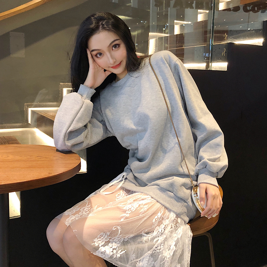 港味加絨抽繩衛衣拼接蕾絲裙擺