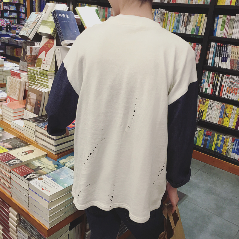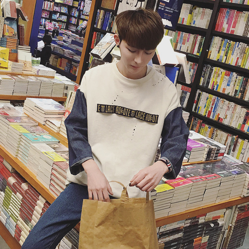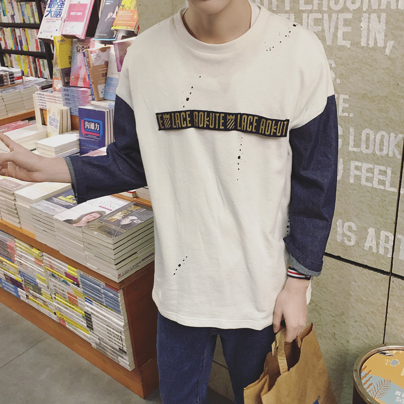 / 秋季新款牛仔拼接男士七分袖T恤潮男韓版打底衫潮