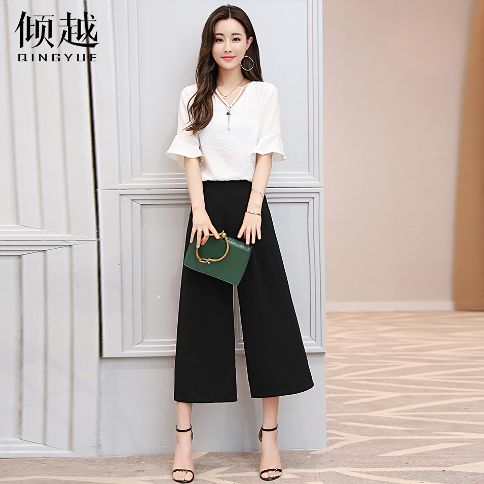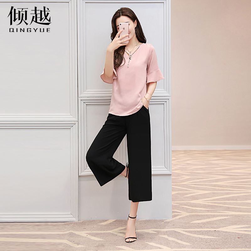 傾越闊腿褲套裝女2017夏季新款時尚潮雪紡兩件套修身小香風職業裝