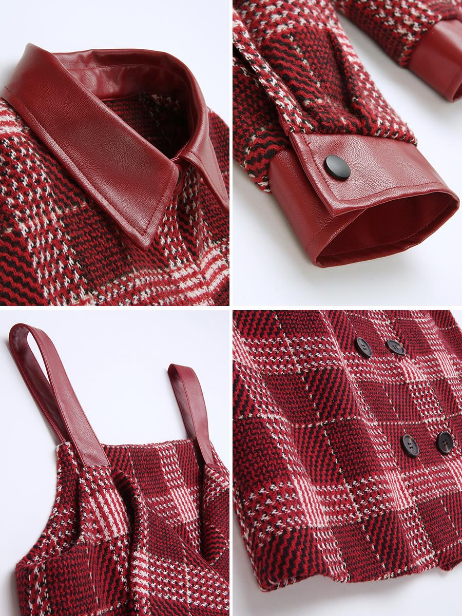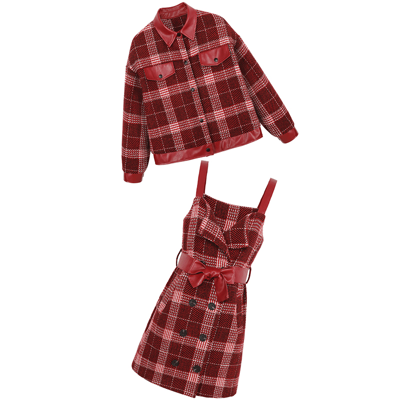 MG小象冬季格子短外套女蝴蝶結收腰吊帶連衣裙新款學生寬松上衣潮