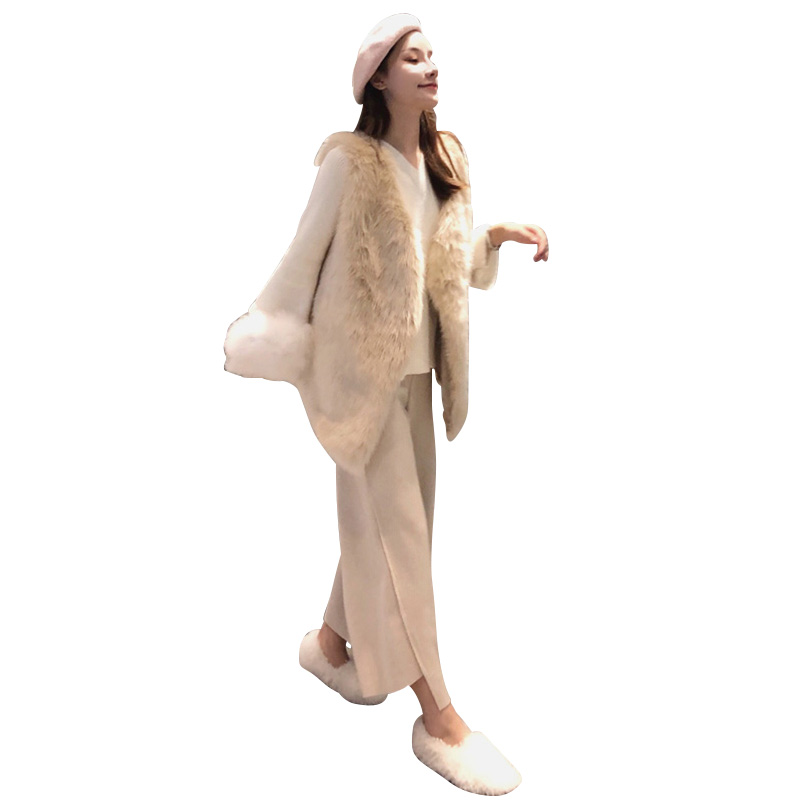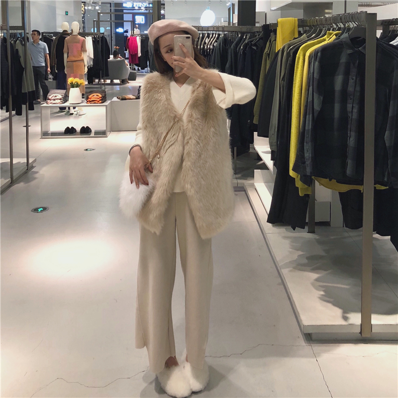 / 寬松無袖毛毛背心馬夾V領長袖針織毛衣百搭毛呢闊腿褲時尚套裝潮