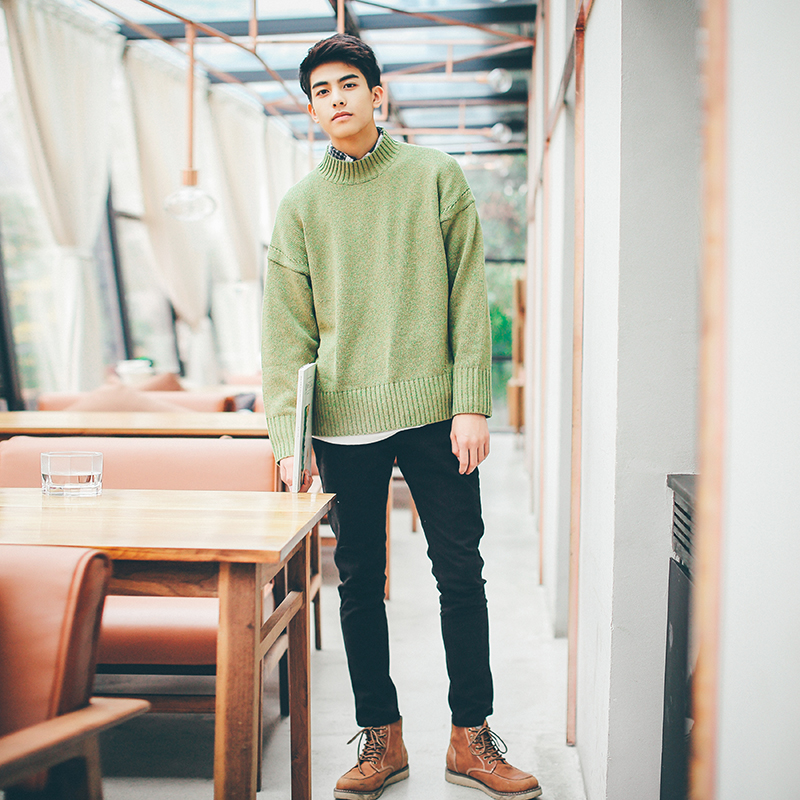 新款秋冬裝原創韓版寬松版男套頭半高領針織衫毛衣加厚保暖