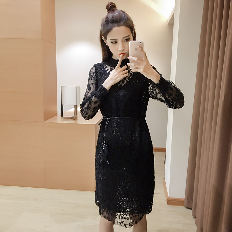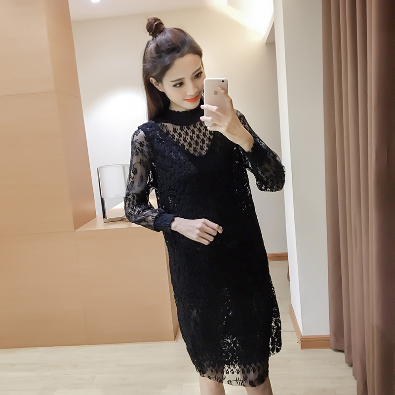 / 早春新款女裝韓版蕾絲背帶裙兩件套春秋中長款修身長袖連衣裙
