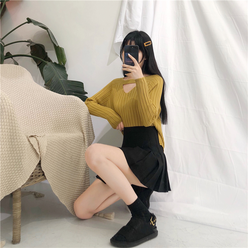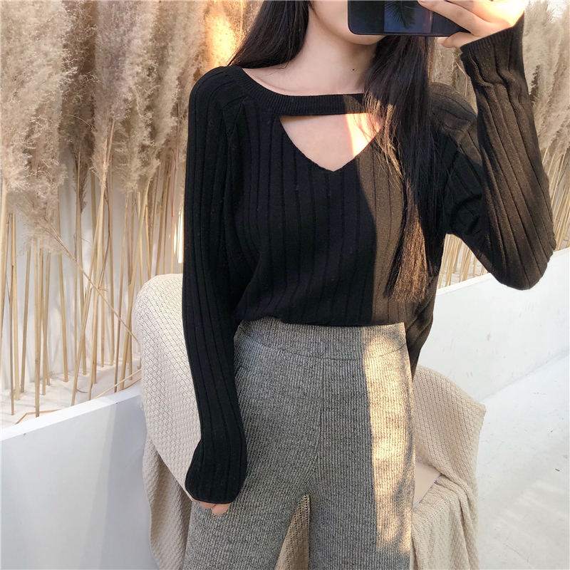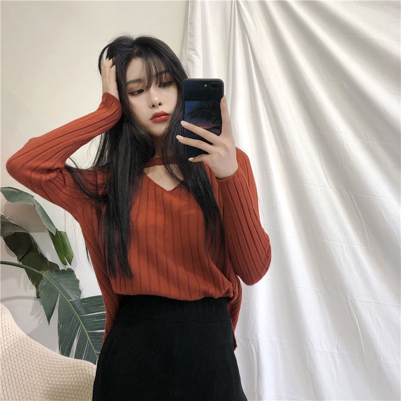 chic上衣女新款韓版秋冬修身打底衫慵懶風套頭毛衣V領掛脖針織衫