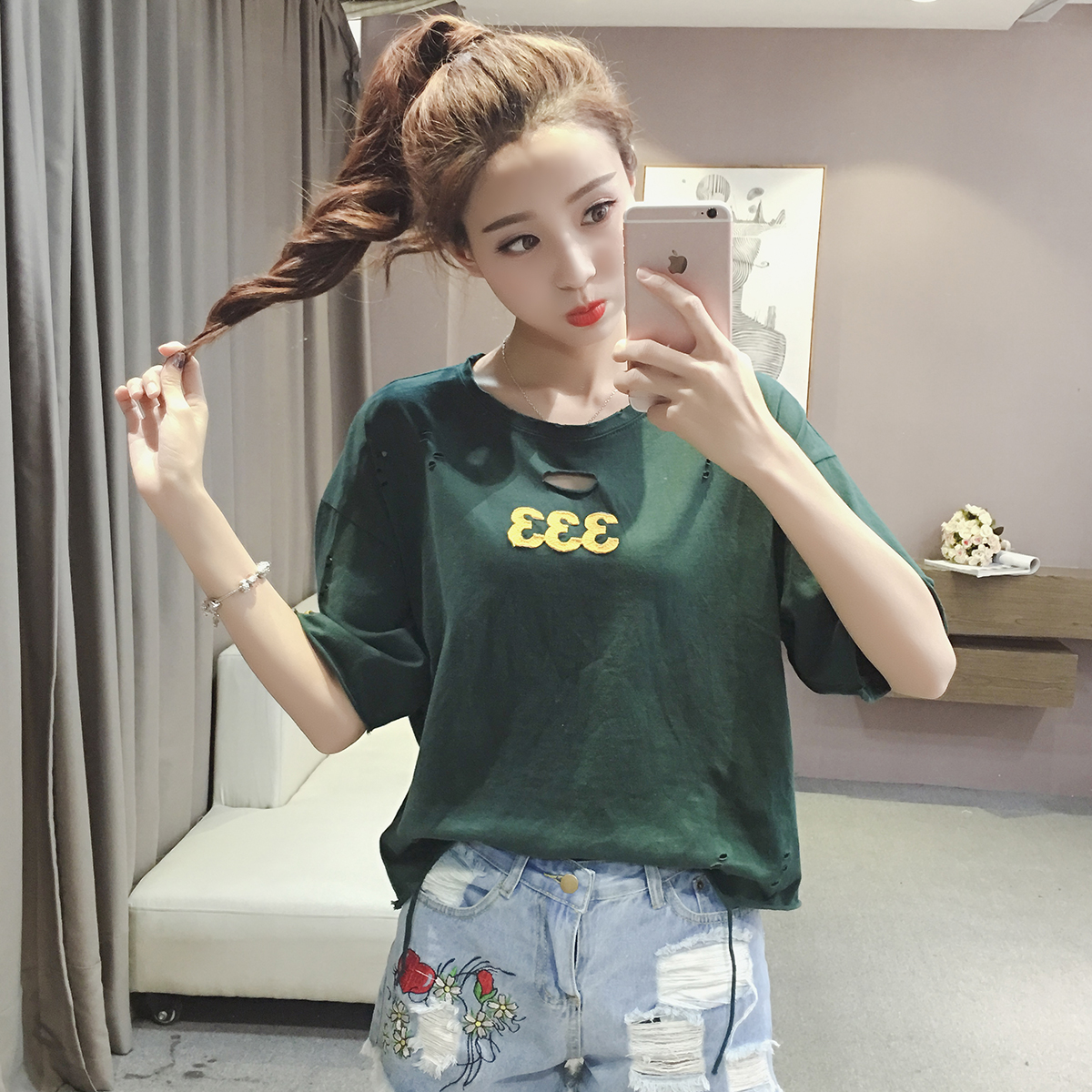 / 短袖t恤女夏季新款韓版學生寬松破洞T恤百搭數字貼布上衣小衫