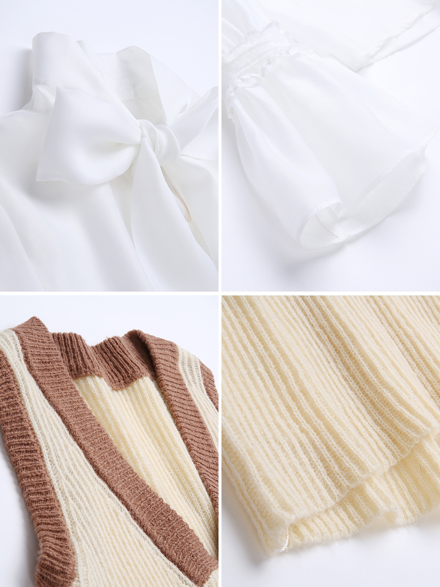MG小象雪紡白襯衫女外搭V領針織背心蝴蝶結小清新復古chic上衣潮