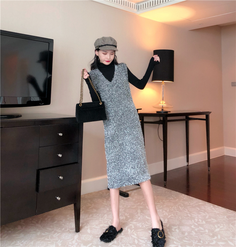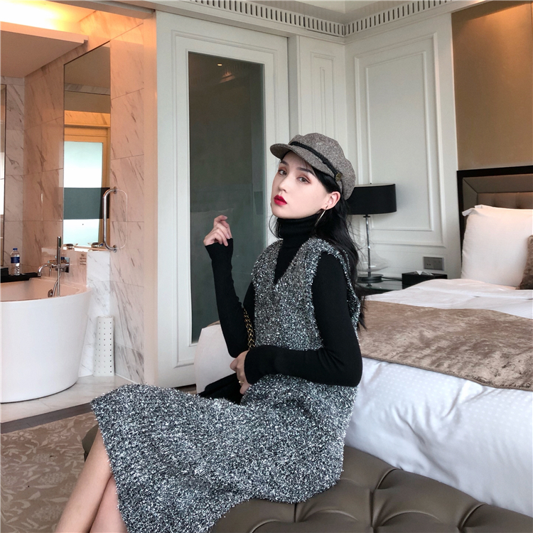 港味新款女裝時尚寬松亮閃針織長裙加厚高領毛衣時髦套裝兩件套潮