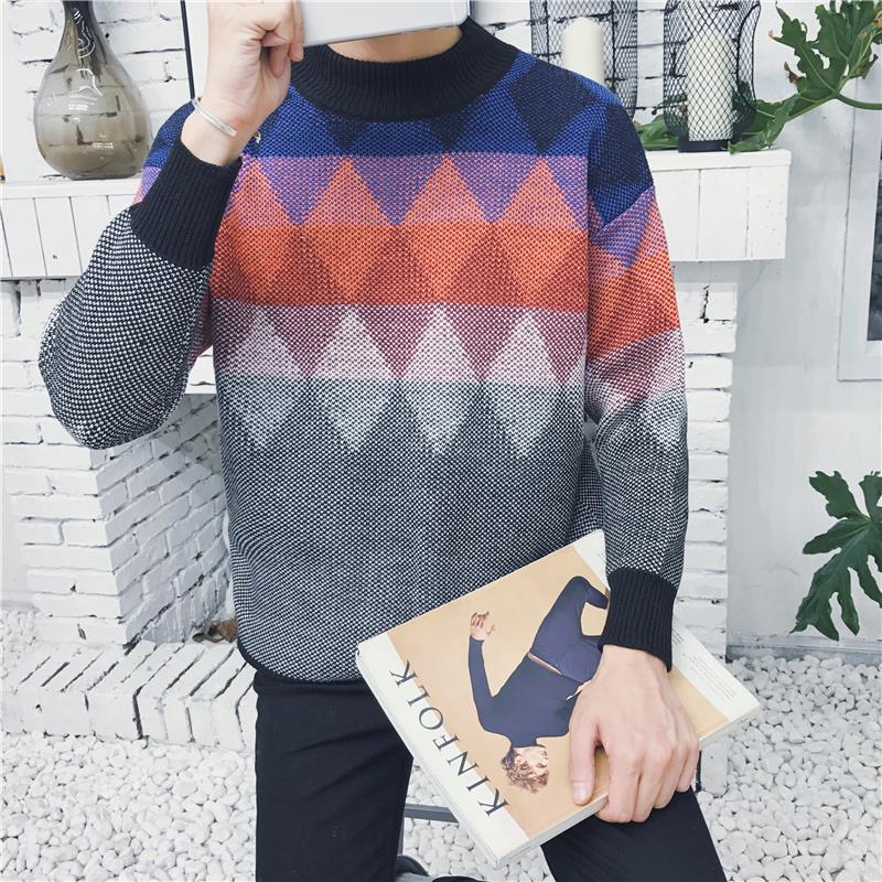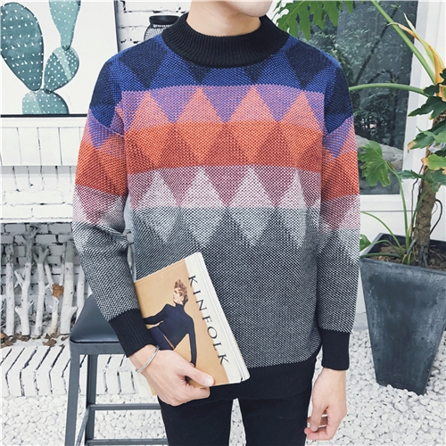 / 新款冬裝港風幾何花色撞色韓版圓領男士套頭毛衣