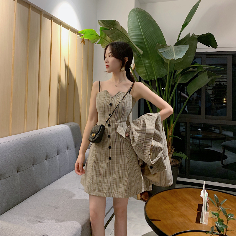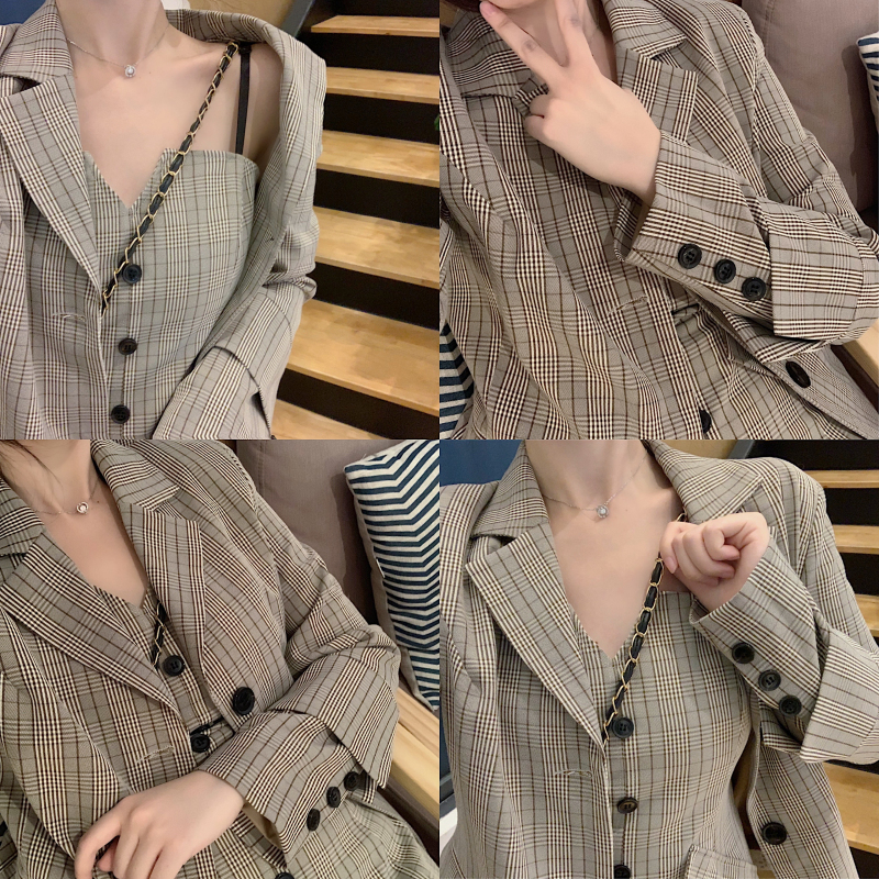 / 名媛氣質潮流時尚套裝韓版格子西服外套百搭v領吊帶連衣裙兩件套