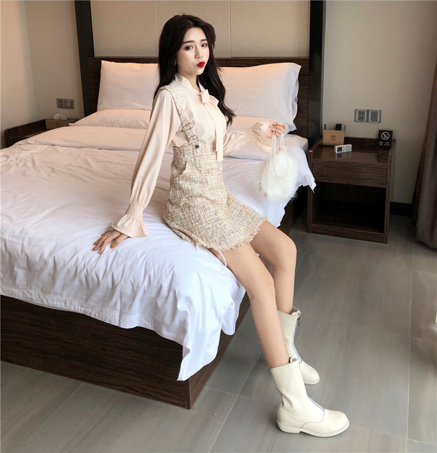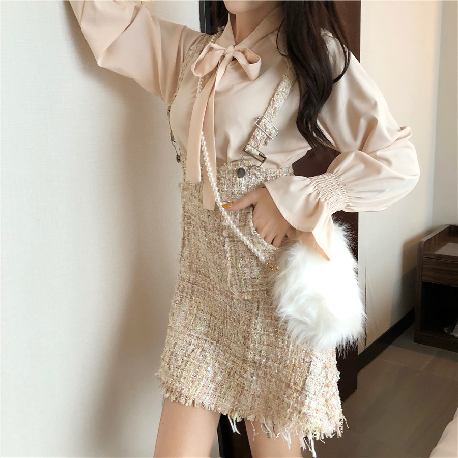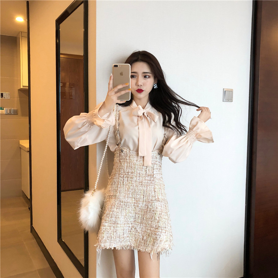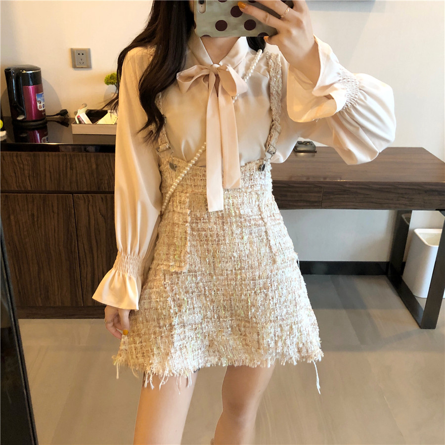 / 秋裝新款韓版時尚套裝小香風超仙長袖襯衫背帶包臀裙網紅兩件套女