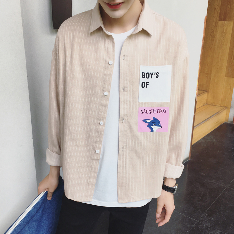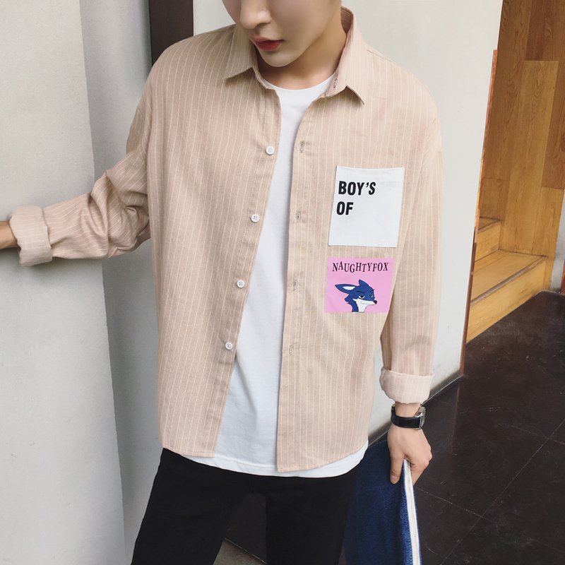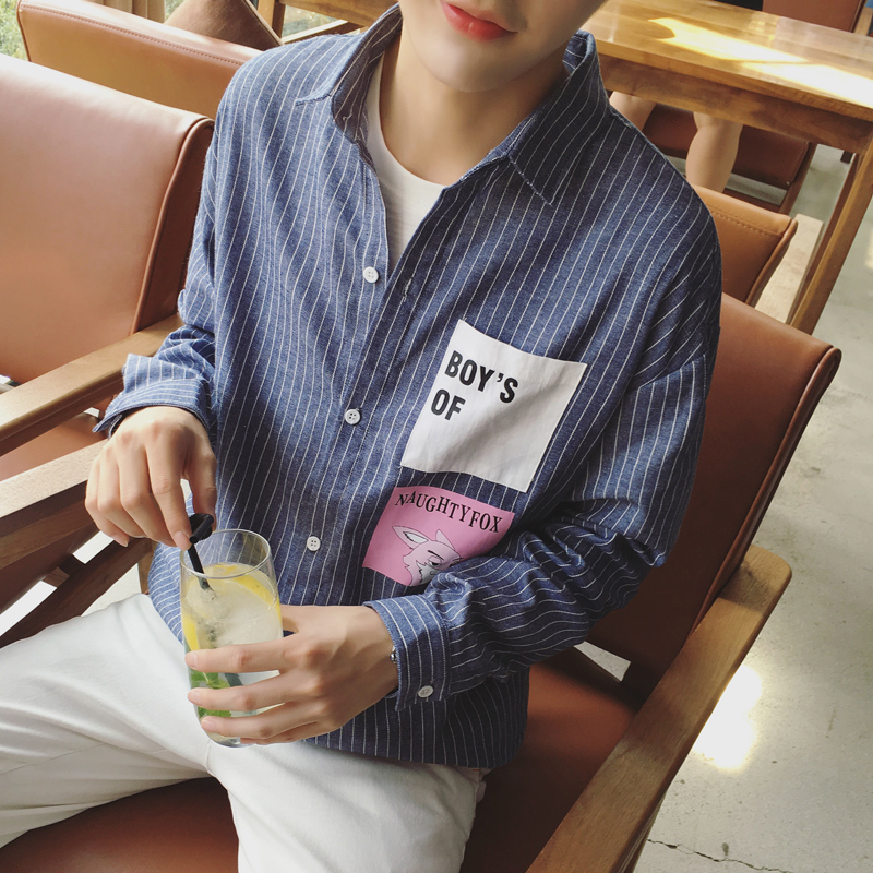 / 秋裝新款印花圖案韓版小清新男士條紋長袖襯衫襯衣