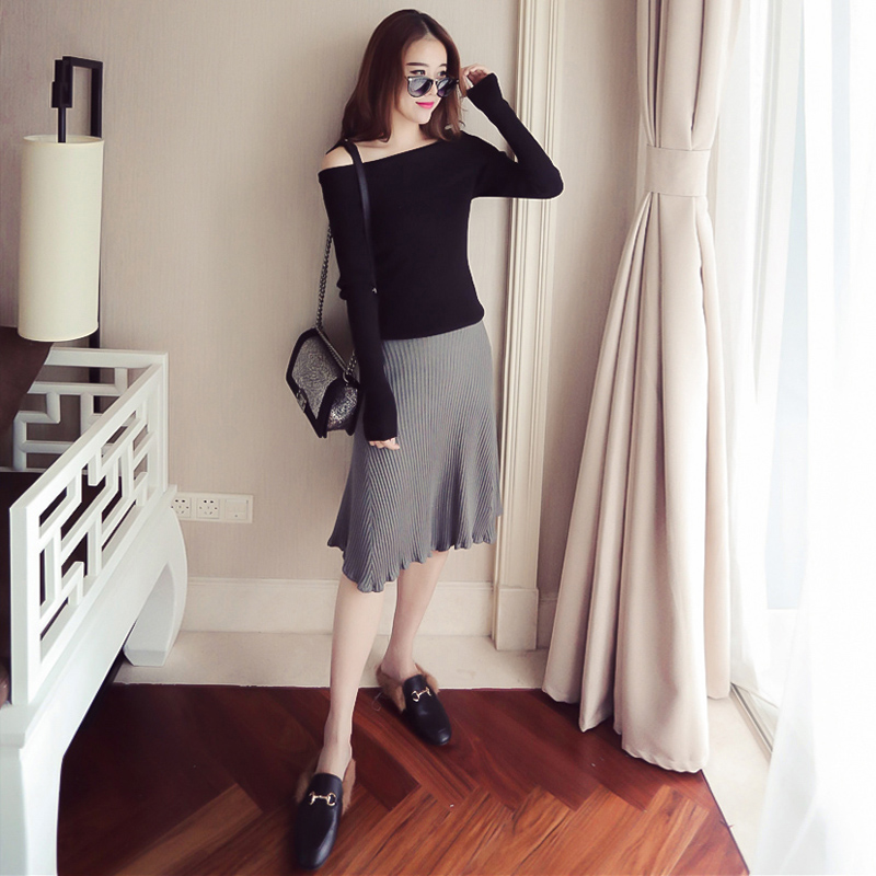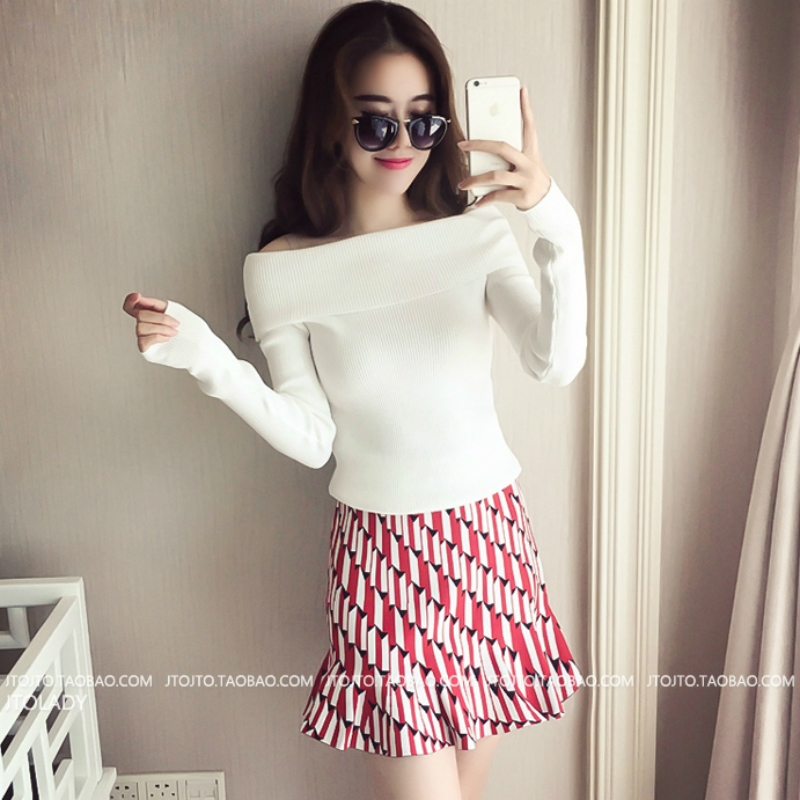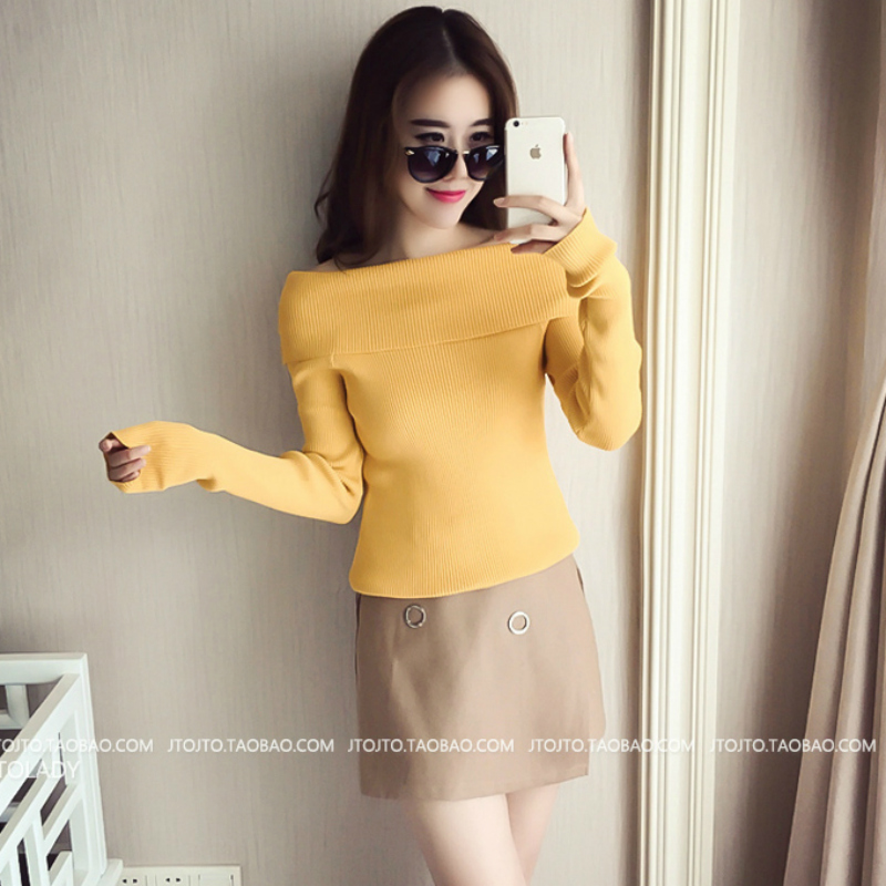 / 春秋裝韓版短款緊身內搭套頭毛衣一字領漏肩長袖打底針織衫女上衣
