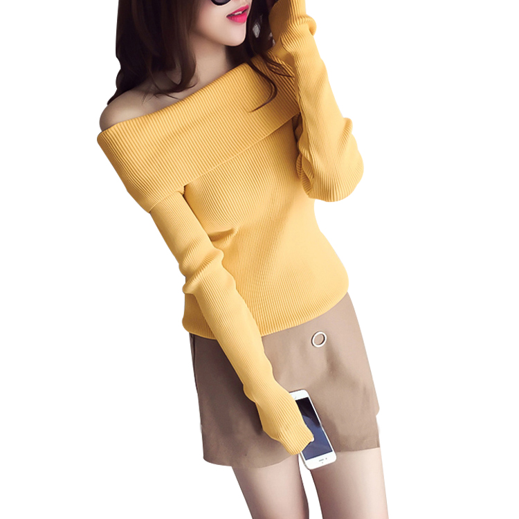 春秋裝韓版短款緊身內搭套頭毛衣一字領漏肩長袖打底針織衫女上衣