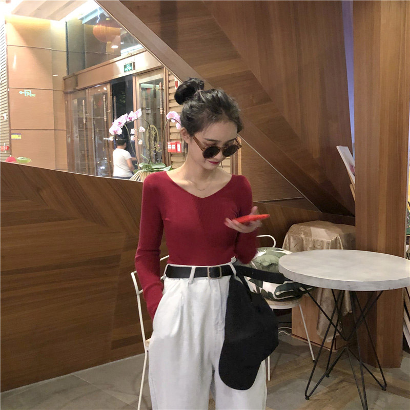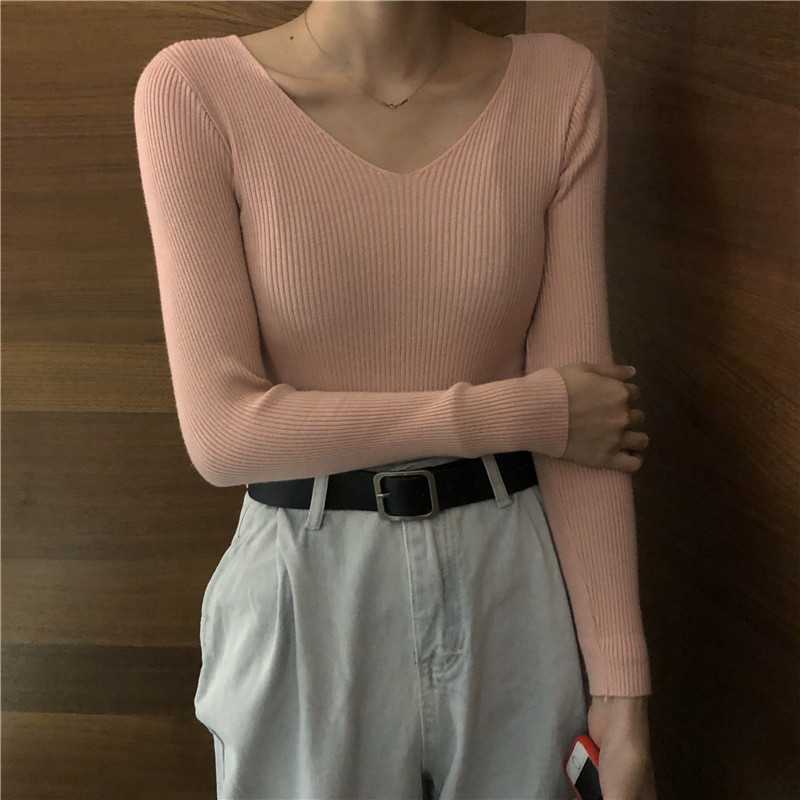毛衣女套頭韓版2018新款早秋純色V領長袖修身顯瘦百搭打底針織衫