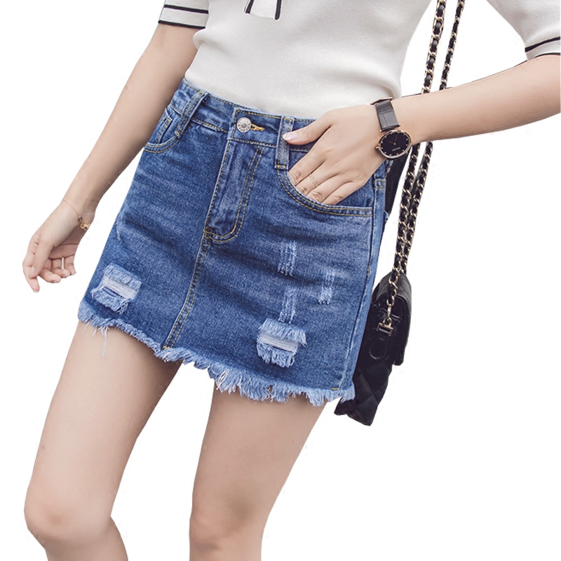 / 韓版高腰牛仔裙半身裙女A子短裙包臀半裙防走光褲裙破洞流蘇裙夏