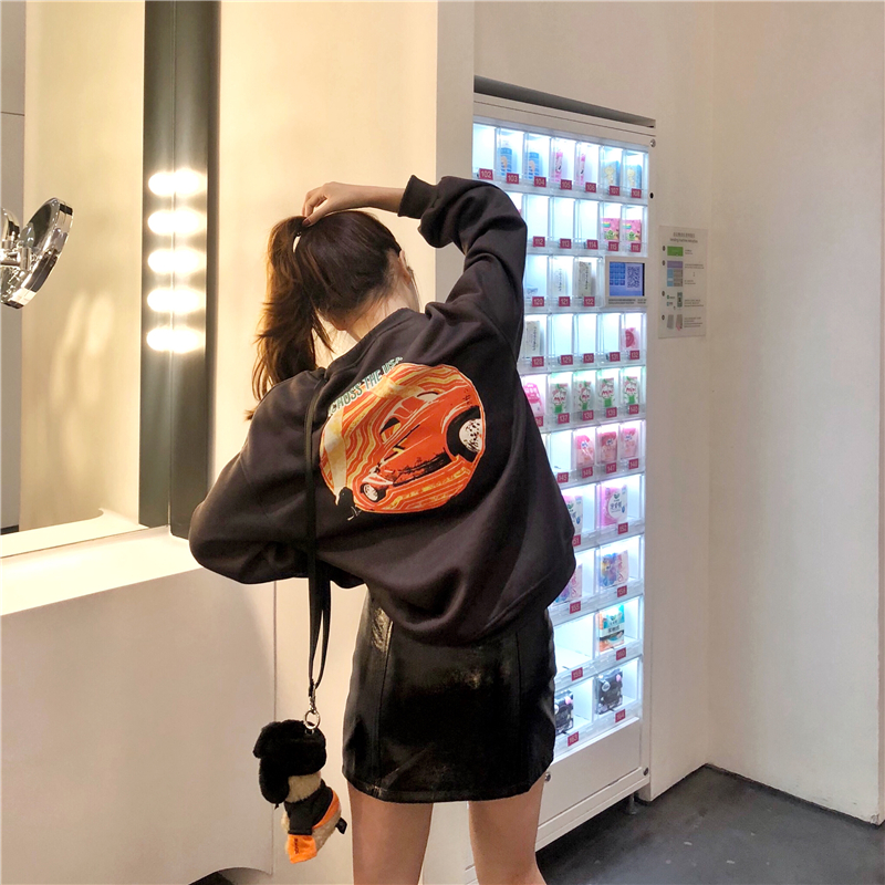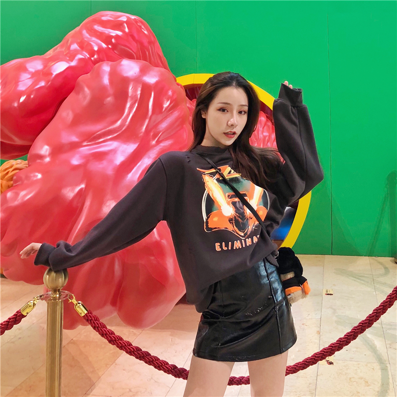 / 新款重工做舊港味印花加絨衛衣時尚套裝百搭高腰亮面皮裙兩件套女