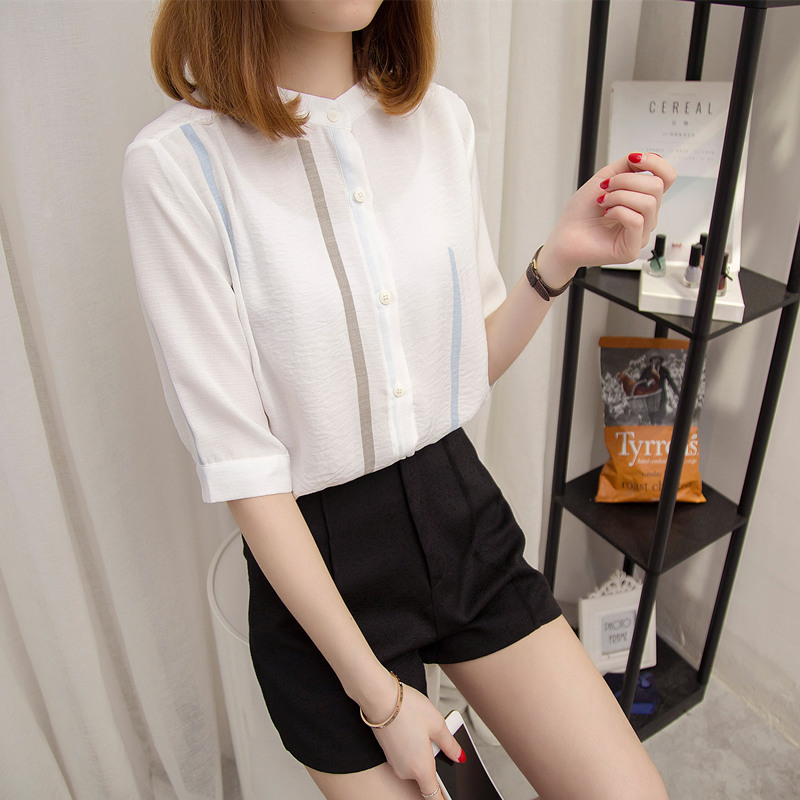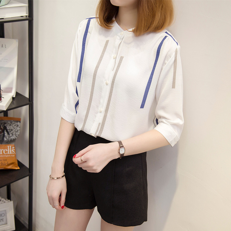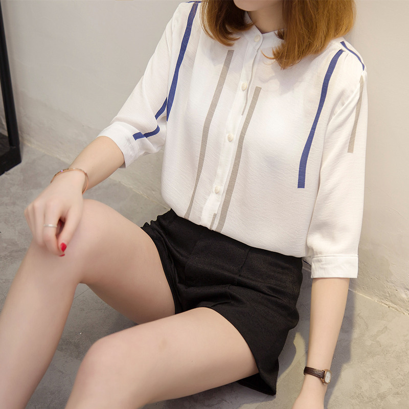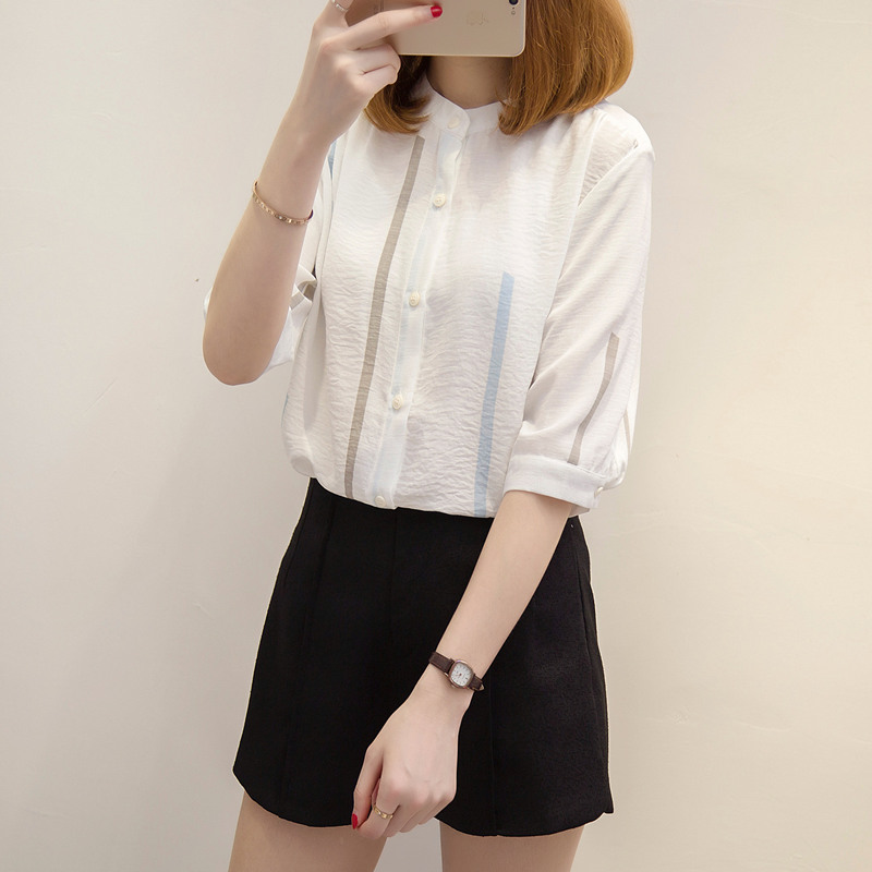 夏裝新款女裝白襯衣女寬松小清新上衣韓范防曬衣條紋襯衫女夏