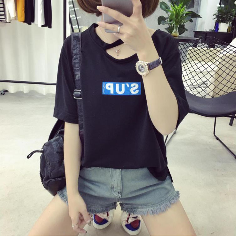 短袖t恤女新款掛脖上衣女字母寬松半袖休閑小衫學生百搭體恤