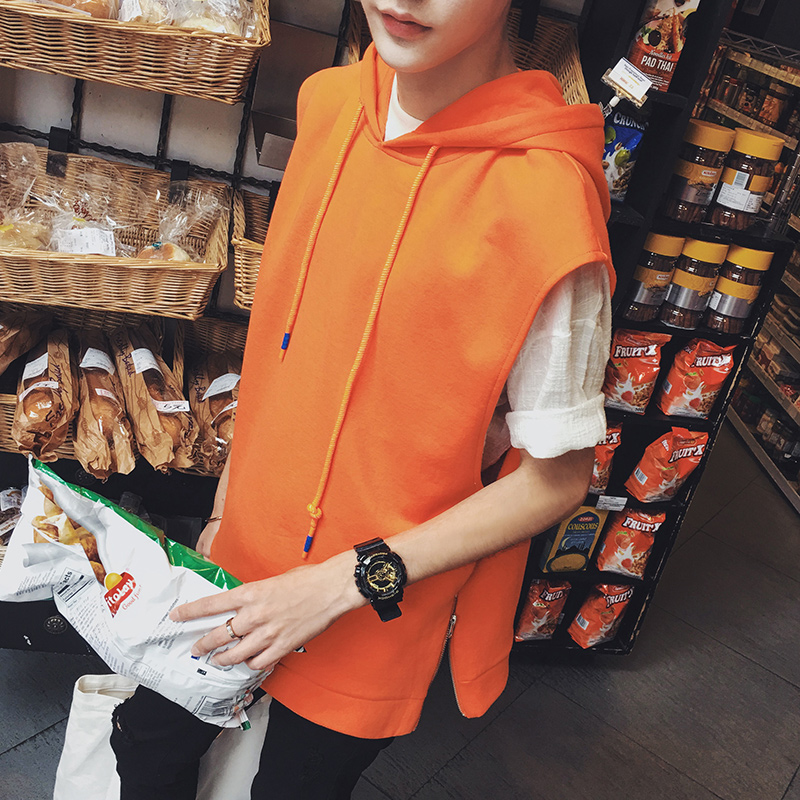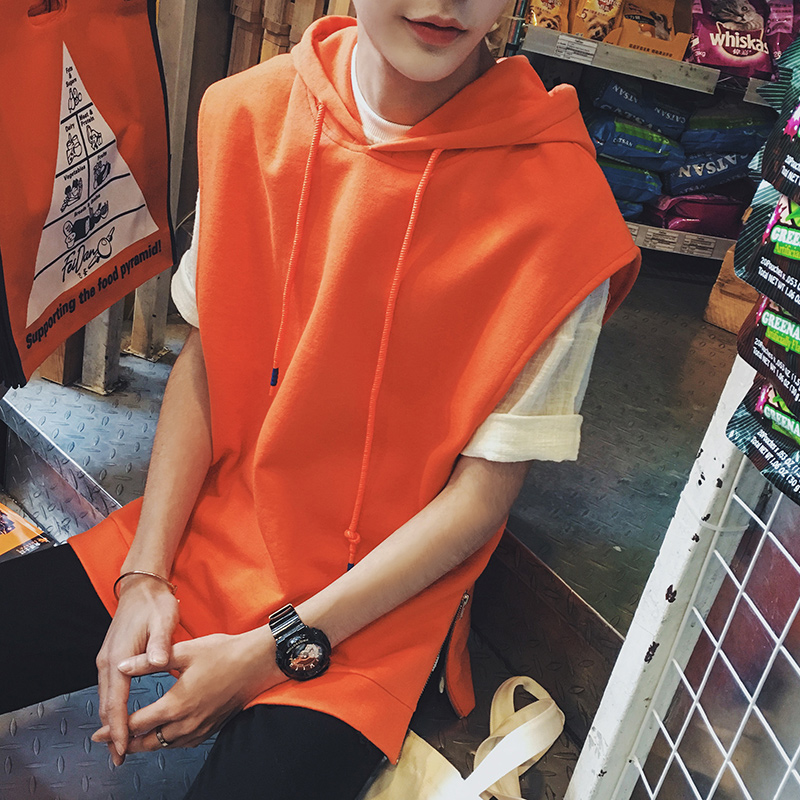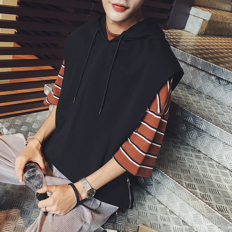 / 新款潮流時尚無袖寬松港系男士連帽套頭T恤