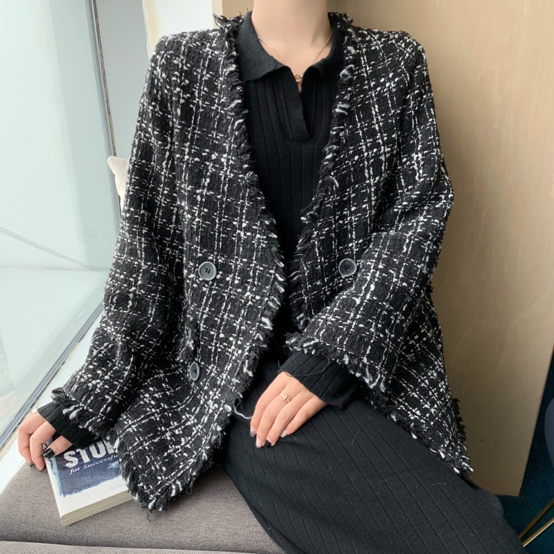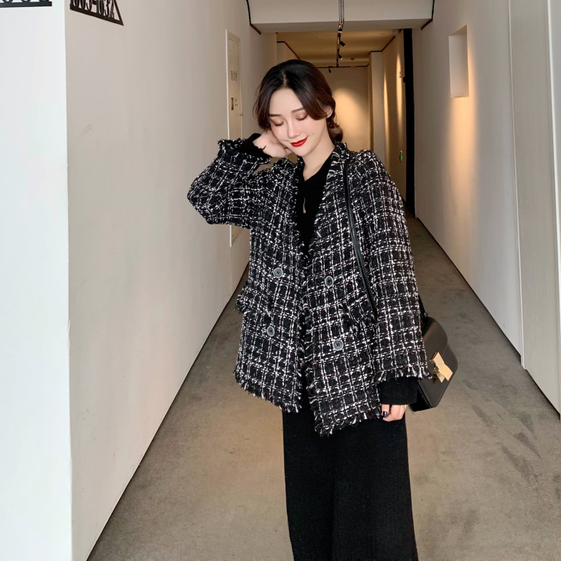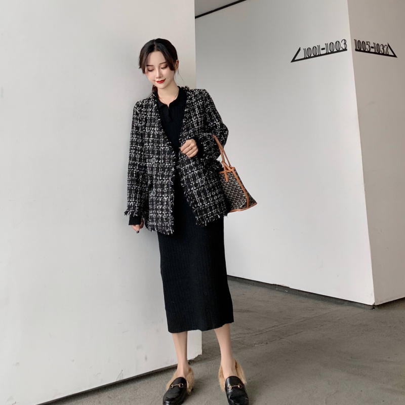 / 粗花呢小香風毛呢秋冬短款流蘇外套+中長款復古長袖打底裙