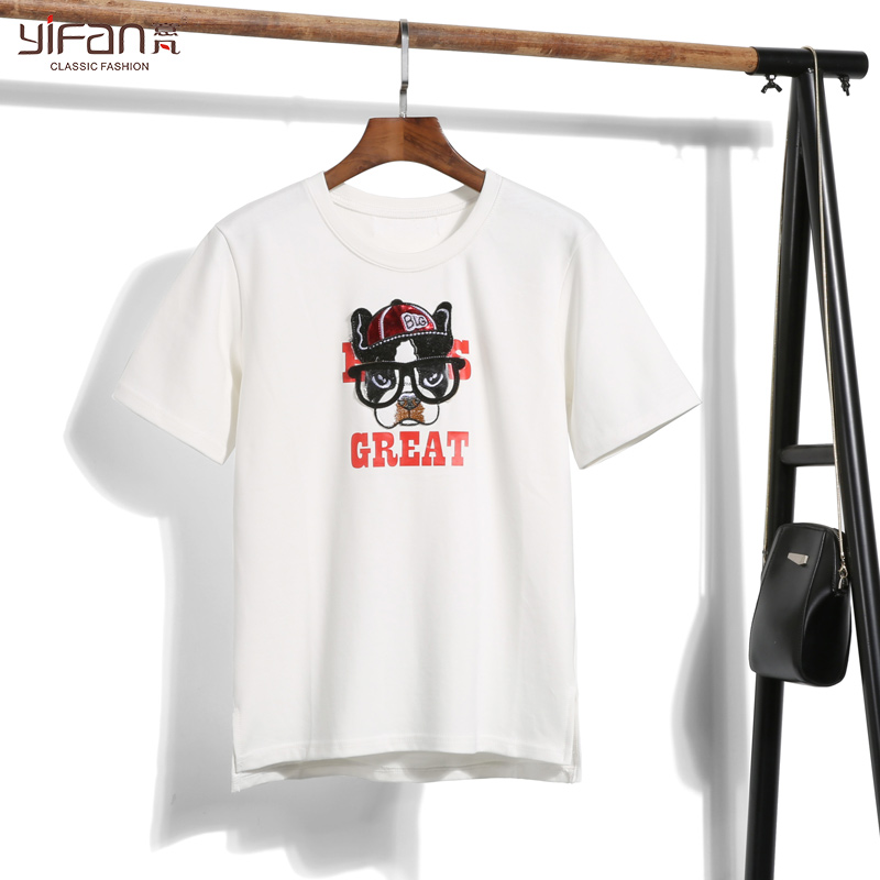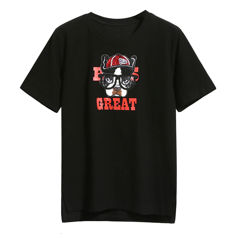 / 春夏新款卡通狗貼布套頭短袖T恤寬松純色簡約女裝百搭學生裝