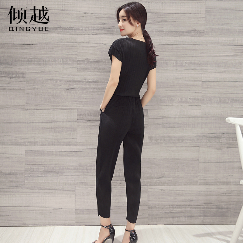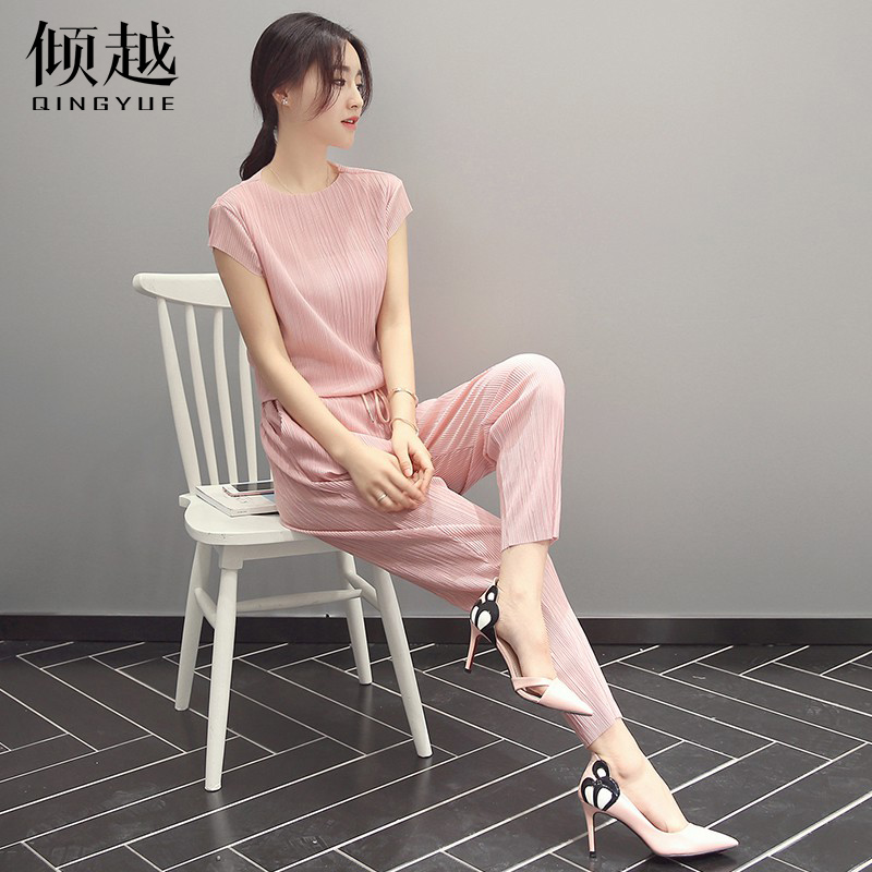傾越2017夏季短袖雪紡衫九分褲休閑套裝寬松顯瘦兩件套夏大碼女裝