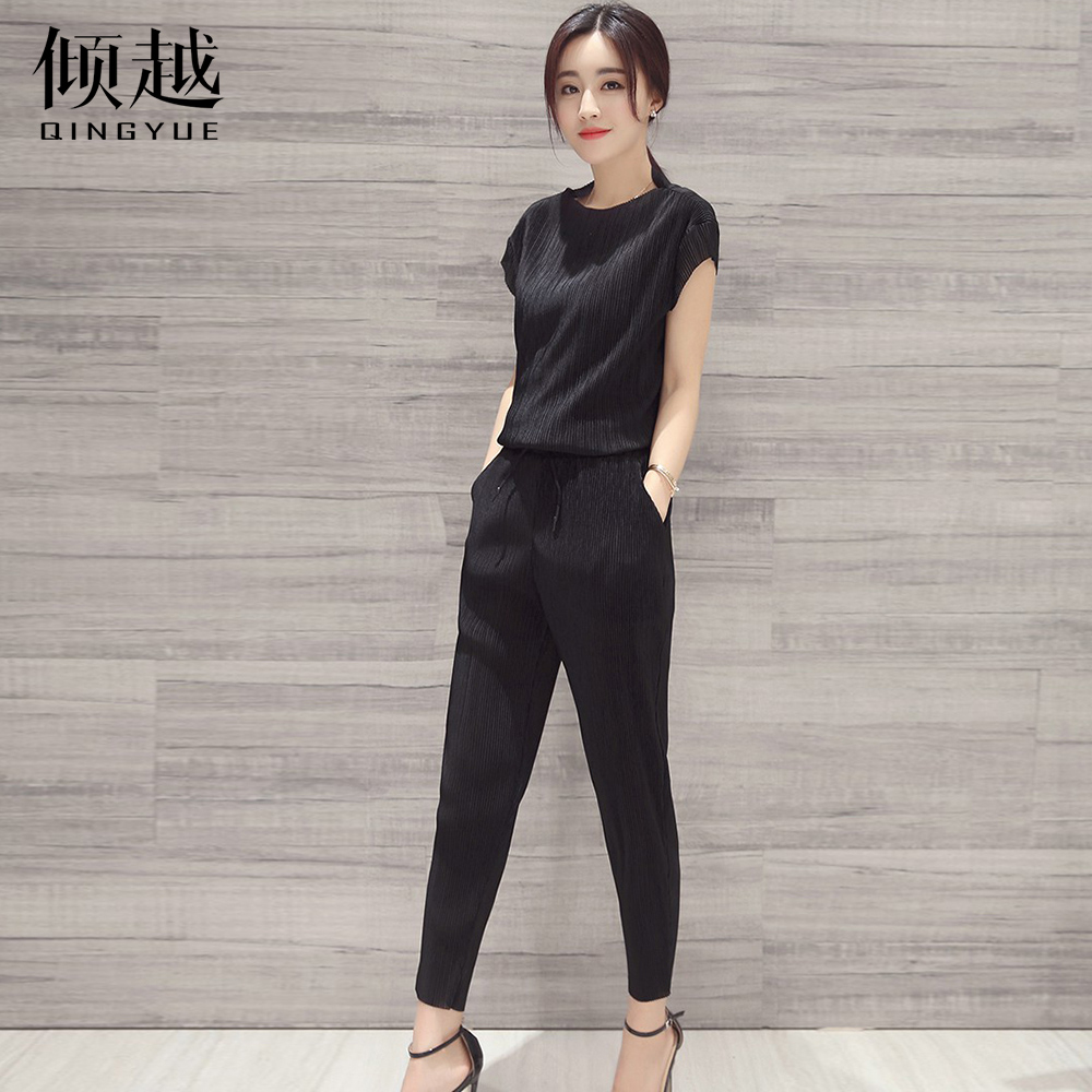 / 傾越2017夏季短袖雪紡衫九分褲休閑套裝寬松顯瘦兩件套夏大碼女裝