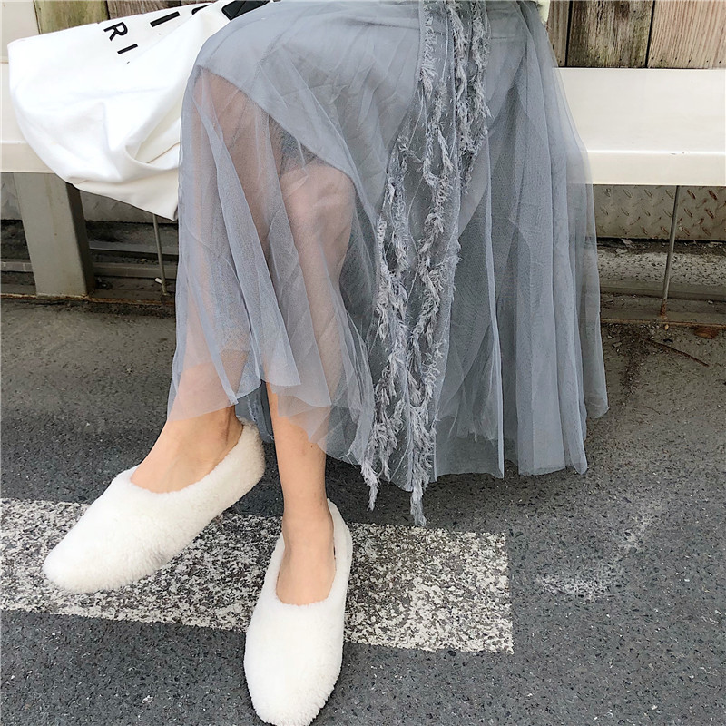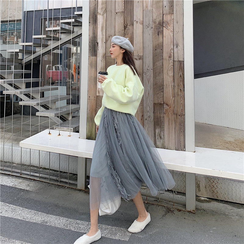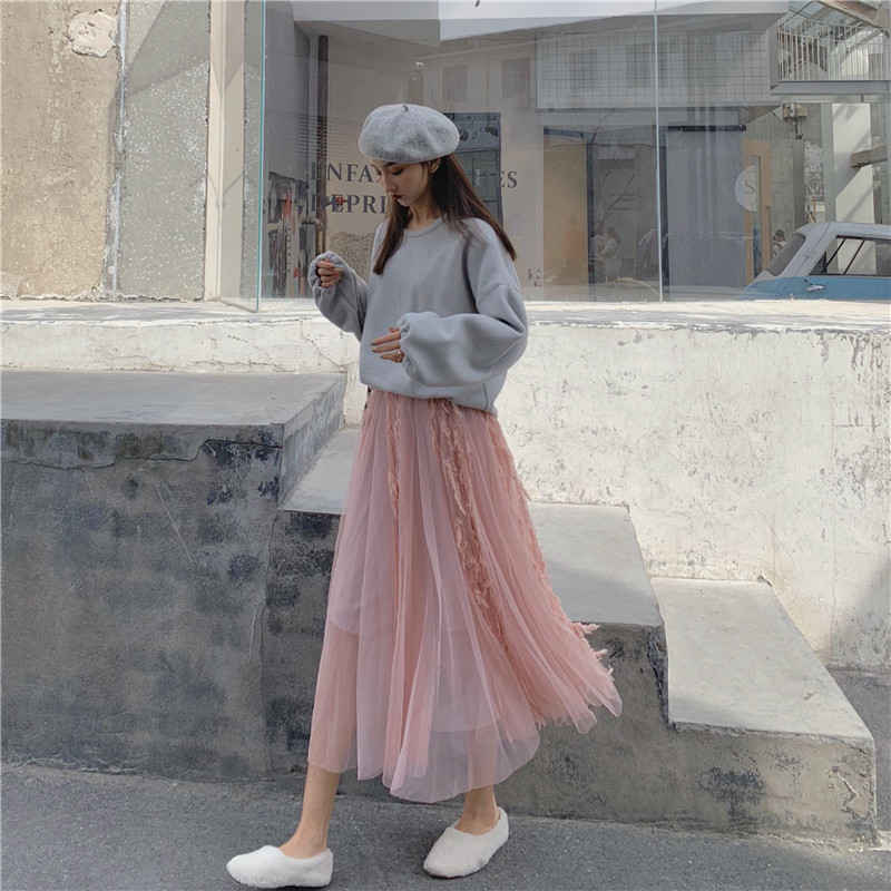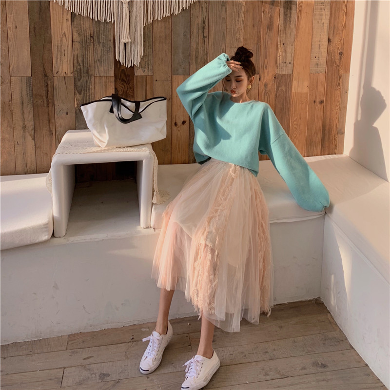 2018秋冬新款流蘇蕾絲拼接網紗半身裙中長款高腰傘裙