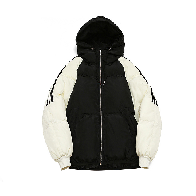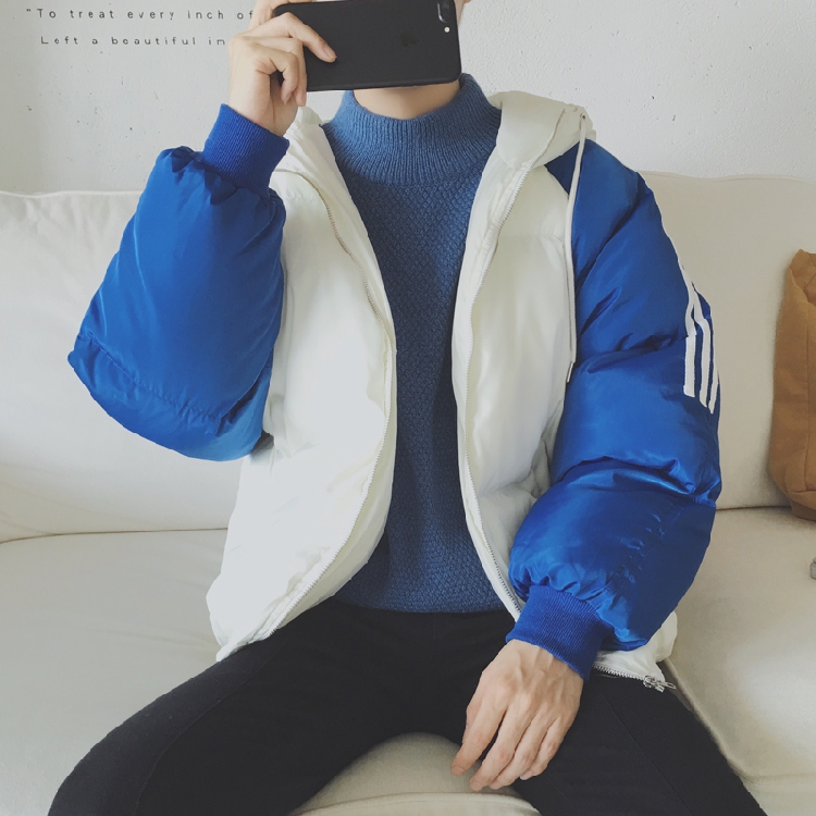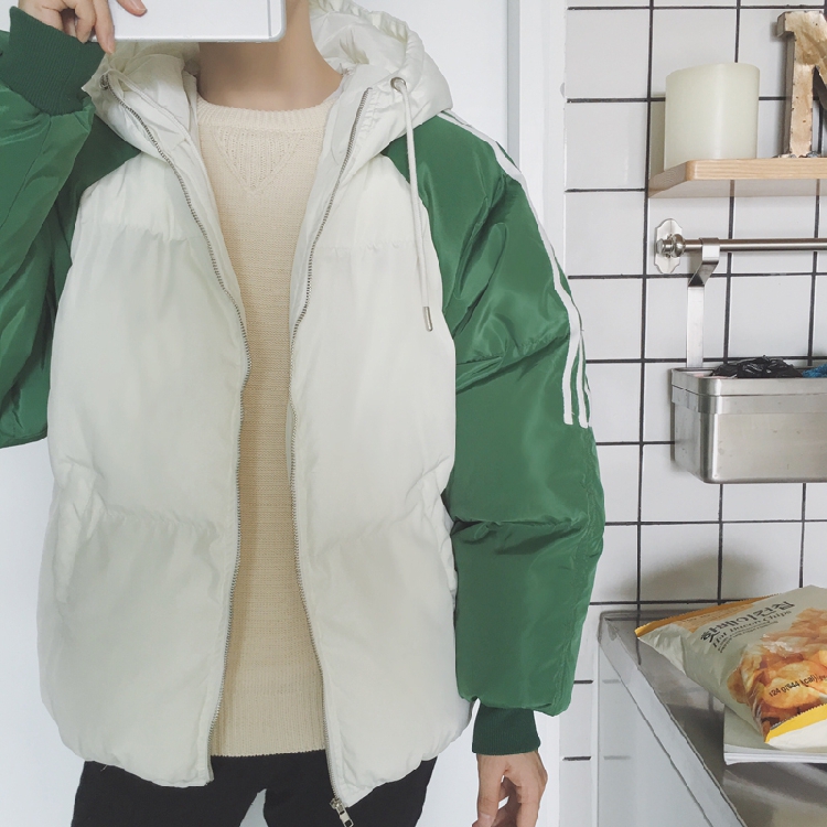 新款男裝袖子拼色韓版連帽加厚男士短款面包服棉衣