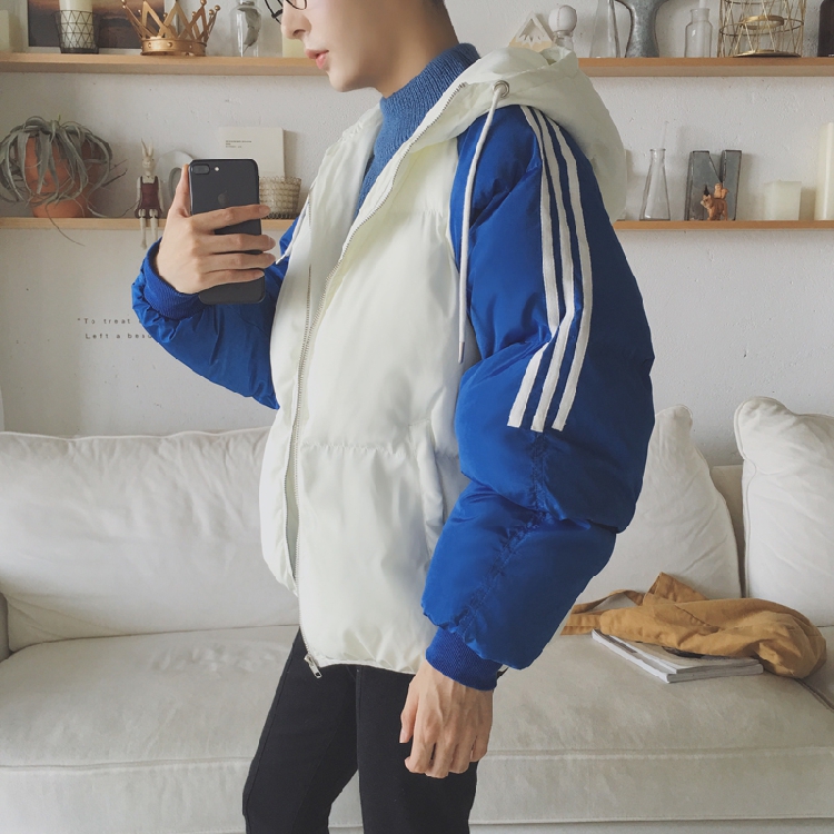 / 新款男裝袖子拼色韓版連帽加厚男士短款面包服棉衣