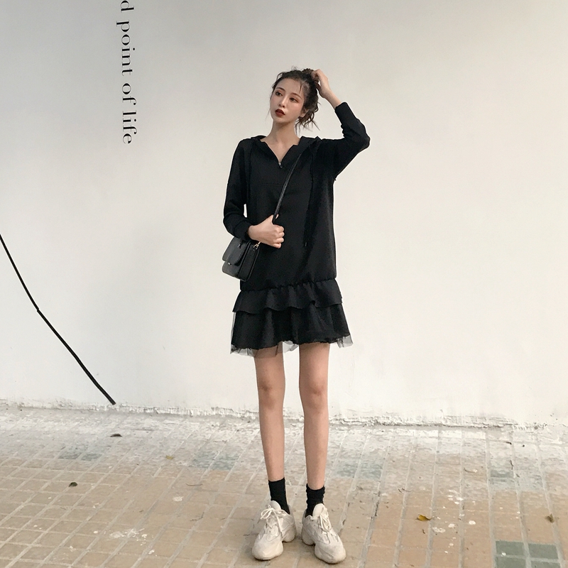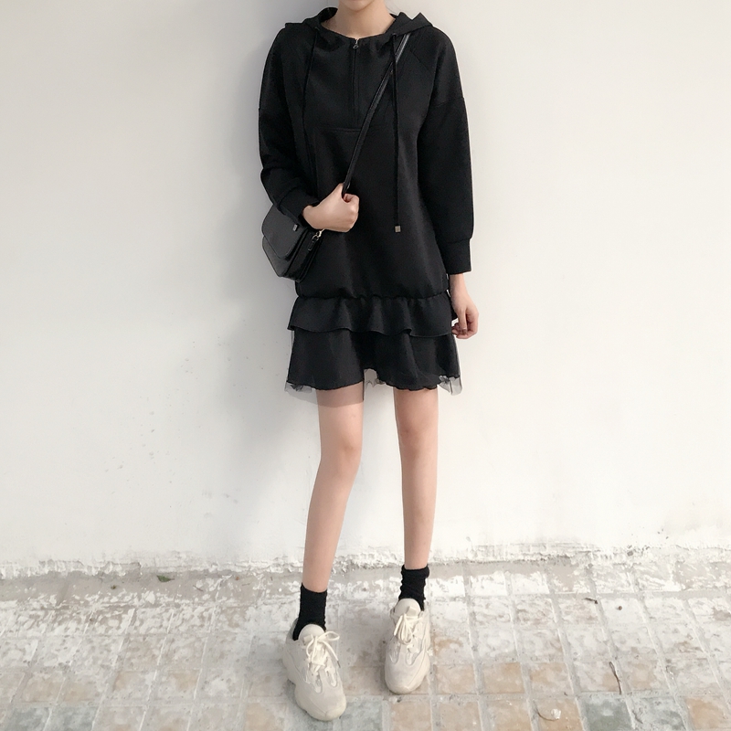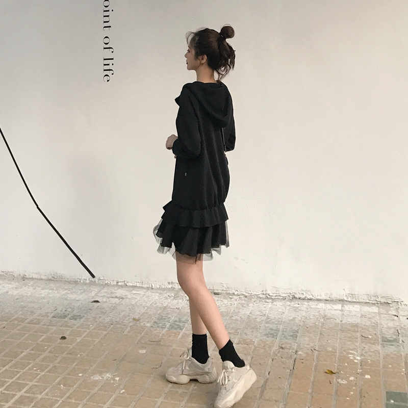 秋冬新款韓版衛衣連衣裙拼接假兩件紗裙少女裙長袖荷葉邊魚尾裙潮