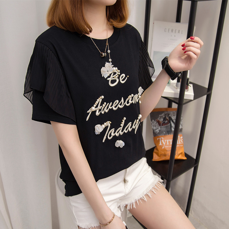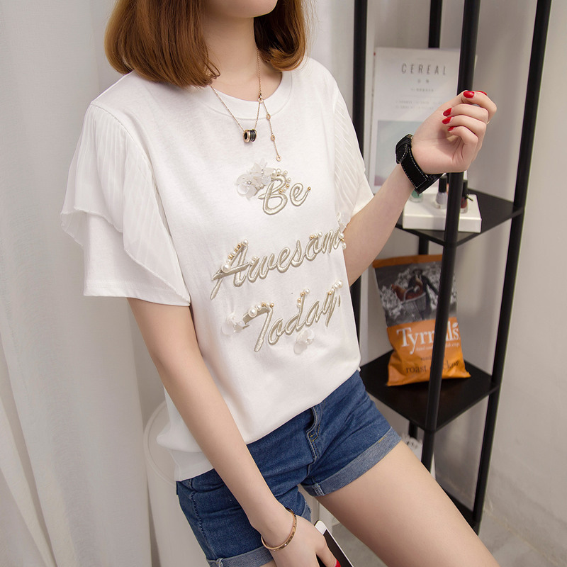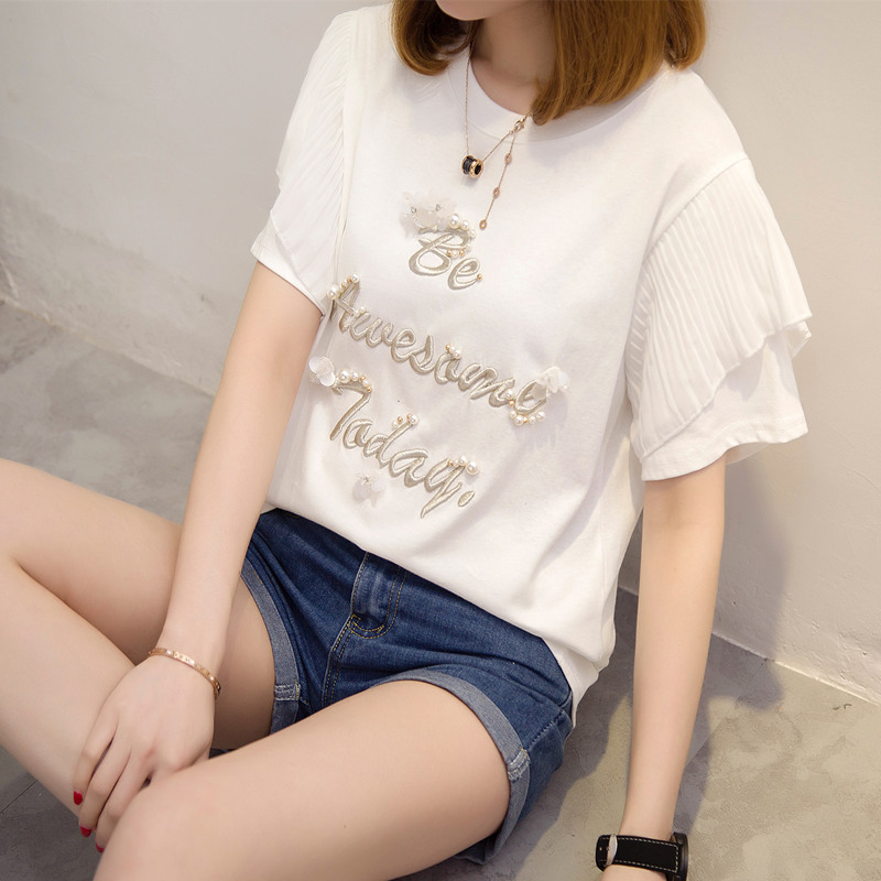 夏裝新款女裝上衣刺繡字母白色t恤女短袖寬松韓版休閑百搭潮